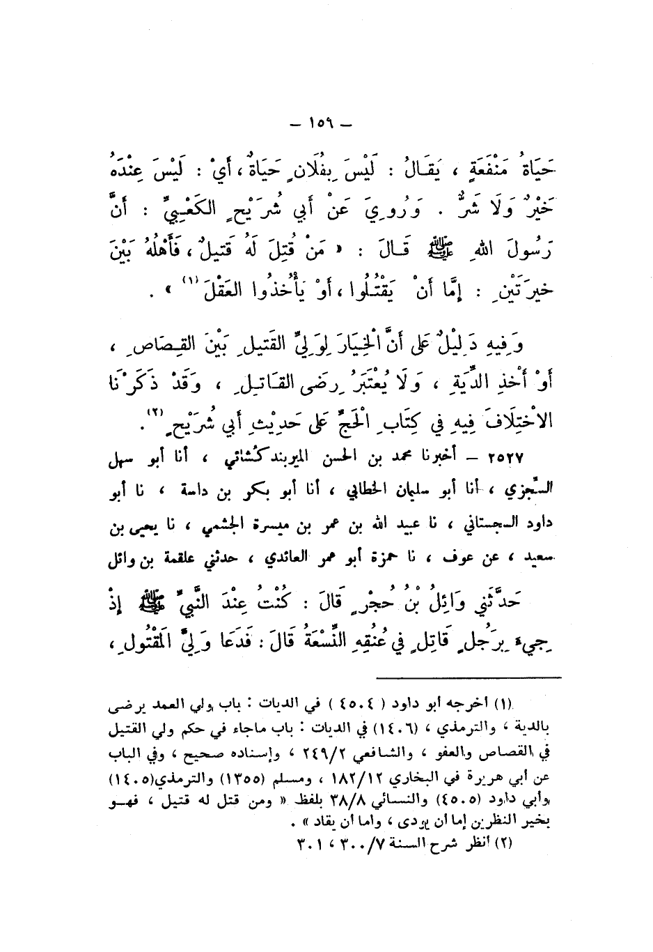 2527 - أَخْبَرَنَا مُحَمَّدُ بْنُ الْحَسَنِ الْمِيرْبَنْدُ كُشَائِيُّ، أَنا أَبُو سَهْلٍ السِّجْزِيُّ، أَنا أَبُو سُلَيْمَانَ الْخَطَّابِيُّ، أَنا أَبُو بَكْرِ بْنُ دَاسَةَ، نَا أَبُو دَاوُدَ السِّجِسْتَانِيُّ، نَا عُبَيْدُ اللَّهِ بْنُ عُمَرَ بْنِ مَيْسَرَةَ الْجَشْمِيُّ، نَا يَحْيَى بْنُ سَعِيدٍ، عَنْ عَوْفٍ، نَا حَمْزَةُ أَبُو عُمَرَ الْعَائِدِيُّ، حَدَّثَنِي عَلْقَمَةُ بْنُ وَائِلٍ، حَدَّثَنِي وَائِلُ بْنُ حُجْرٍ، قَالَ: كُنْتُ عِنْدَ النَّبيِّ صَلَّى اللهُ عَلَيْهِ وَسَلَّمَ إِذْ جِيءَ بِرَجُلٍ قَاتِلٍ فِي عُنُقِهِ النّسعة، قَالَ: فَدَعَا وَلِيَّ الْمَقْتُولِ،