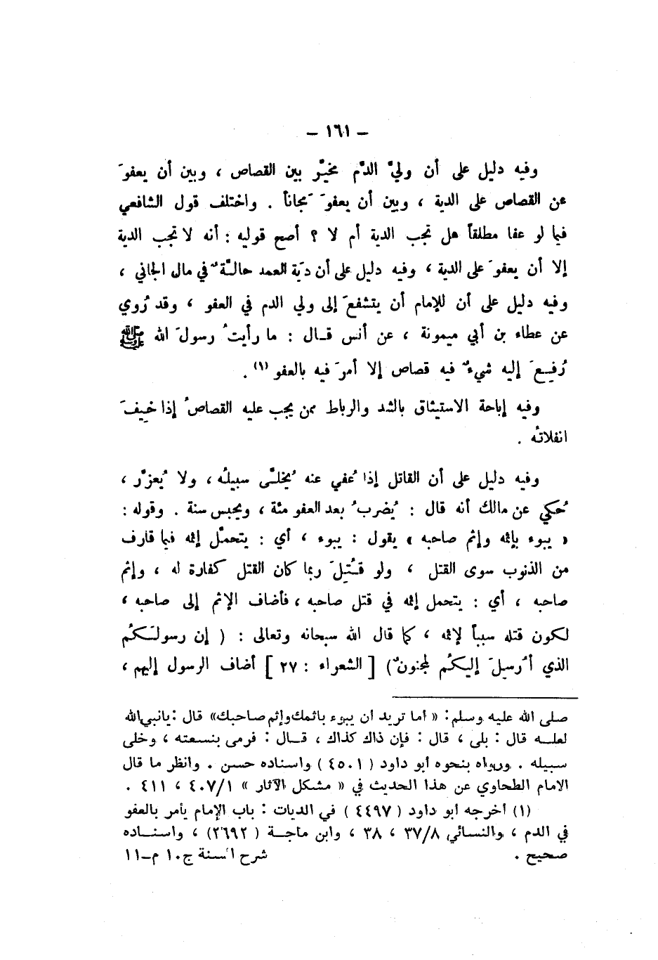 وَاخْتَلَفَ قَوْلُ الشَّافِعِيِّ فِيمَا لَوْ عَفَا مُطْلَقًا هَلْ تَجِبُ الدِّيَةُ أَمْ لَا؟ أَصَحُّ قَوْلَيْهِ: أَنَّهُ لَا تَجِبُ الدِّيَةُ إِلا أَنْ يَعْفُوَ عَلَى الدِّيَةِ، وَفِيهِ دَلِيلٌ عَلَى أَنَّ دِيَةَ الْعَمْدِ حَالَةٌ فِي مَالِ الْجَانِي، وَفِيهِ دَلِيلٌ عَلَى أَنَّ لِلإِمَامِ أَنْ يَتَشَفَّعَ إِلَى وَلِيِّ الدَّمِ فِي الْعَفْوِ، وَقَدْ رُوِيَ عَنْ عَطَاءِ بْنِ أَبِي مَيْمُونَةَ، عَنْ أَنَسٍ، قَالَ: مَا رأَيْتُ رَسُولَ اللَّهِ صَلَّى اللهُ عَلَيْهِ وَسَلَّمَ «رُفِعَ إِلَيْهِ شَيْءٌ فِيهِ قِصَاصٌ إِلا أَمَرَ فِيهِ بِالْعَفْوِ».
