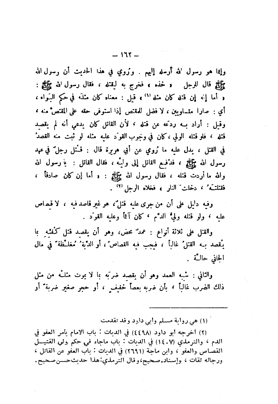 وَالْقَتْلُ عَلَى ثَلاثَةِ أَنْوَاعٍ: عَمْدٌ مَحْضٌ، وَهُوَ أَنْ يَقْصِدَ قَتْلَ كُفْئِهِ، بِمَا يُقْصَدُ بِهِ الْقَتْلُ غَالِبًا، فَيَجِبُ فِيهِ الْقِصَاصُ أَوِ الدِّيَةُ مُغلَّظةً فِي مَالِ الْجَانِي حَالَّةً.