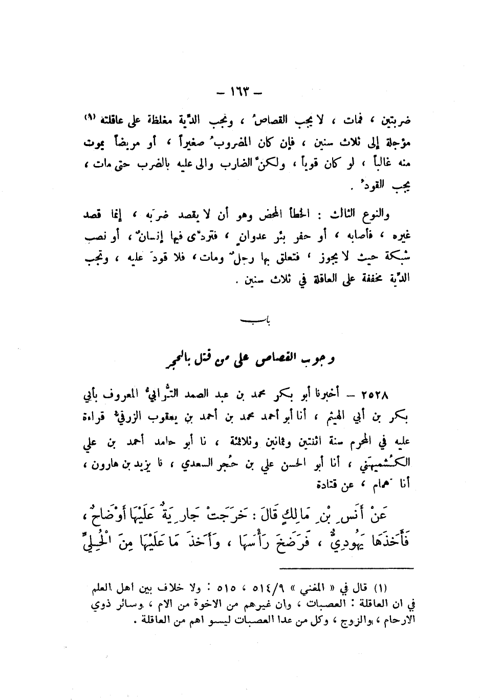 2528 - أَخْبَرَنَا أَبُو بَكْرٍ مُحَمَّدُ بْنُ عَبْدِ الصَّمَدِ التُّرَابِيُّ الْمَعْرُوفُ بِأَبِي بَكْرِ بْنِ أَبِي الْهَيْثَمِ، أَنا أَبُو أَحْمَدَ مُحَمَّدِ بْنِ أَحْمَدَ بْنِ يَعْقُوبَ الزُّرَقِيُّ، قِرَاءَةً عَلَيْهِ فِي الْمُحَرَّمِ سَنَةَ اثْنَتَيْنِ وَثَمَانِينَ وَثَلاثِ مِائَةٍ، أَنا أَبُو حَامِدٍ أَحْمَدُ بْنُ عَلِيٍّ الْكُشْمِيهَنِيُّ، أَنا أَبُو الْحَسَنِ عَلِيُّ بْنُ حُجْرٍ السَّعْدِيُّ، أَنا يَزِيدُ بْنُ هَارُونَ، أَنا هَمَّامٌ، عَنْ قَتَادَةَ، عَنْ أَنَسِ بْنِ مَالِكٍ، قَالَ: خَرَجَتْ جَارِيَةٌ عَلَيْهَا أَوْضَاحٌ، فأَخَذَهَا يَهُودِيٌّ، فَرَضَخَ رَأْسَهَا، وَأَخَذَ مَا عَلَيْهَا مِنَ الْحُلِيِّ