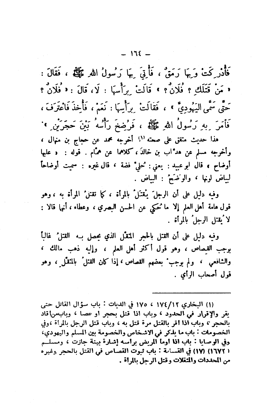 وَفِيهِ دَلِيلٌ عَلَى أَنَّ الْقَتْلَ بِالْحَجَرِ الْمُثَقَّلِ الَّذِي يَحْصُلُ بِهِ الْقَتْلُ غَالِبًا يُوجِبُ الْقِصَاصَ، وَهُوَ قَوْلُ أَكْثَرِ أَهْلِ الْعِلْمِ، وَإِلَيْهِ ذَهَبَ مَالِكٌ، وَالشَّافِعِيُّ، وَلَمْ يُوجِبْ بَعْضُهُمُ الْقِصَاصَ، إِذَا كَانَ الْقَتْلُ بِالْمُثَقَّلِ، وَهُوَ قَوْلُ أَصْحَابِ الرَّأْيِ.