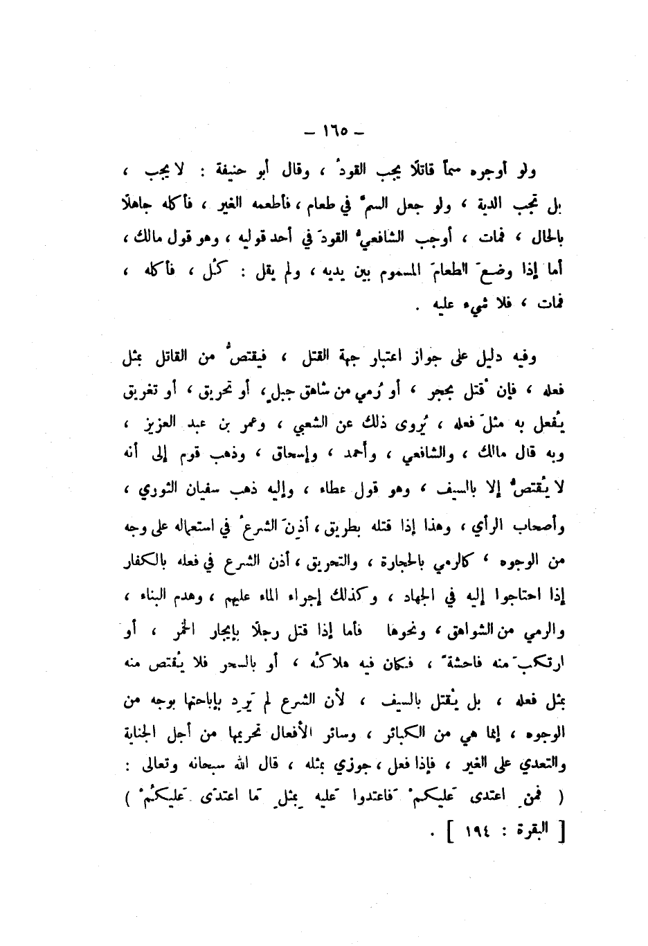 وَفِيهِ دَلِيلٌ عَلَى جَوَازِ اعْتِبَارِ جِهَةِ الْقَتْلِ، فَيُقْتَصُّ مِنَ الْقَاتِلِ بِمِثْلِ فِعْلِهِ، فَإِنْ قُتِلَ بِحَجَرٍ، أَوْ رُمِيَ مِنْ شَاهِقِ جَبَلٍ، أَوْ تَحْرِيقٌ، أَوْ تَغْرِيقٌ يُفْعَلُ بِهِ مِثْلُ فِعْلِهِ، يُرْوَى ذَلِكَ عَنِ الشَّعْبِيِّ، وَعُمَرَ بْنِ عَبْدِ الْعَزِيزِ، وَبِهِ قَالَ مَالِكٌ، وَالشَّافِعِيُّ، وَأَحْمَدُ، وَإِسْحَاقُ، وَذَهَبَ قَوْمٌ إِلَى أَنَّهُ لَا يُقْتَصُّ إِلا بِالسَّيْفِ، هُوَ قَوْلُ عَطَاءٍ، وَإِلَيْهِ ذَهَبَ سُفْيَانُ الثَّوْرِيُّ، وَأَصْحَابُ الرَّأْيِ، وَهَذَا إِذَا قَتَلَهُ بِطَرِيقٍ، أَذِنَ الشَّرْعُ فِي اسْتِعْمَالِهِ عَلَى وَجْهٍ مِنَ الْوُجُوهِ، كَالرَّمْيِ بِالْحِجَارَةِ، وَالتَّحْرِيقِ، أَذِنَ الشَّرْعُ فِي فِعْلِهِ بِالْكُفَّارِ إِذَا احْتَاجُوا إِلَيْهِ فِي الْجِهَادِ، وَكَذَلِكَ إِجْرَاءُ الْمَاءِ عَلَيْهِمْ، وَهَدْمُ الْبِنَاءِ، وَالرَّمْيُ مِنَ الشَّوَاهِقِ، وَنَحْوُهَا، فَأَمَّا إِذَا قَتَلَ رَجُلا بِإِيجَارِ الْخَمْرِ، أَوِ ارْتَكَبَ مِنْهُ فَاحِشَةً، فَكَانَ فِيهَا هَلاكُهُ، أَوْ بِالسِّحْرِ فَلا يُقْتَصُّ مِنْهُ بِمِثْلِ فِعْلِهِ، بَلْ يُقْتَلُ بِالسَّيْفِ، لأَنَّ الشَّرْعَ لَمْ يُرِدْ بِإِبَاحَتِهَا بِوَجْهٍ مِنَ الْوُجُوهِ، إِنَّمَا هِيَ مِنَ الْكَبَائِرِ، وَسَائِرُ الأَفْعَالِ تَحْرِيمُهَا مِنْ أَجْلِ الْجِنَايَةِ، وَالتَّعَدِّي عَلَى الْغَيْرِ، فَإِذَا فَعَلَ، جُوزِيَ بِمِثْلِهِ، قَالَ اللَّهُ سُبْحَانَهُ وَتَعَالَى: {فَمَنِ اعْتَدَى عَلَيْكُمْ فَاعْتَدُوا عَلَيْهِ بِمِثْلِ مَا اعْتَدَى عَلَيْكُمْ} [الْبَقَرَة: 194].