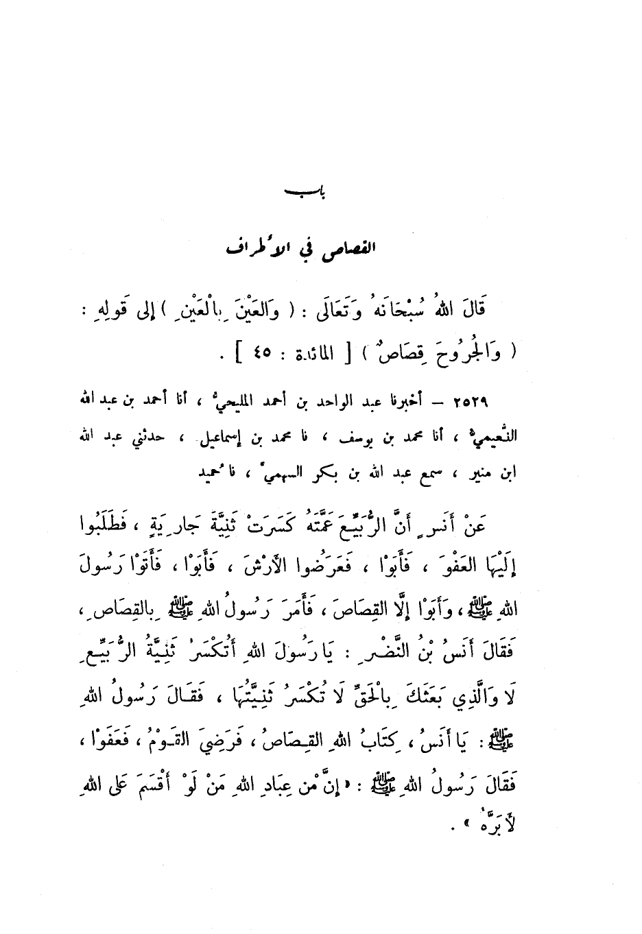 2529 - أَخْبَرَنَا عَبْدُ الْوَاحِدِ بْنُ أَحْمَدَ الْمَلِيحِيُّ، أَنا أَحْمَدُ بْنُ عَبْدِ اللَّهِ النُّعَيْمِيُّ، أَنا مُحَمَّدُ بْنُ يُوسُفَ، نَا مُحَمَّدُ بْنُ إِسْمَاعِيلَ، حَدَّثَنِي عَبْدُ اللَّهِ بْنُ مُنِيرٍ سَمِعَ عَبْدَ اللَّهِ بْنَ بَكْرٍ السَّهْمِيَّ، نَا حُمَيْدٌ، عَنْ أَنَسٍ أَنَّ الرُّبَيِّعَ عَمَّتَهُ كَسَرَتْ ثَنِيَّةَ جَارِيَةٍ، فَطَلَبُوا إِلَيْهَا الْعَفْوَ، فَأَبَوْا، فَعَرَضُوا الأَرْشَ، فَأَبَوْا، فَأَتَوْا رَسُولَ اللَّهِ صَلَّى اللهُ عَلَيْهِ وَسَلَّمَ، وَأَبَوْا إِلا الْقِصَاصَ، فَأَمَرَ رَسُولُ اللَّهِ صَلَّى اللهُ عَلَيْهِ وَسَلَّمَ بِالْقِصَاصِ، فَقَالَ أَنَسُ بْنُ النَّضْرِ: يَا رَسُولَ اللَّهِ، أَتُكْسَرُ ثَنِيَّةُ الرُّبَيِّعِ لَا وَالَّذي بَعَثَكَ بِالْحَقِّ لَا تُكْسَرُ ثَنِيَّتُهَا.