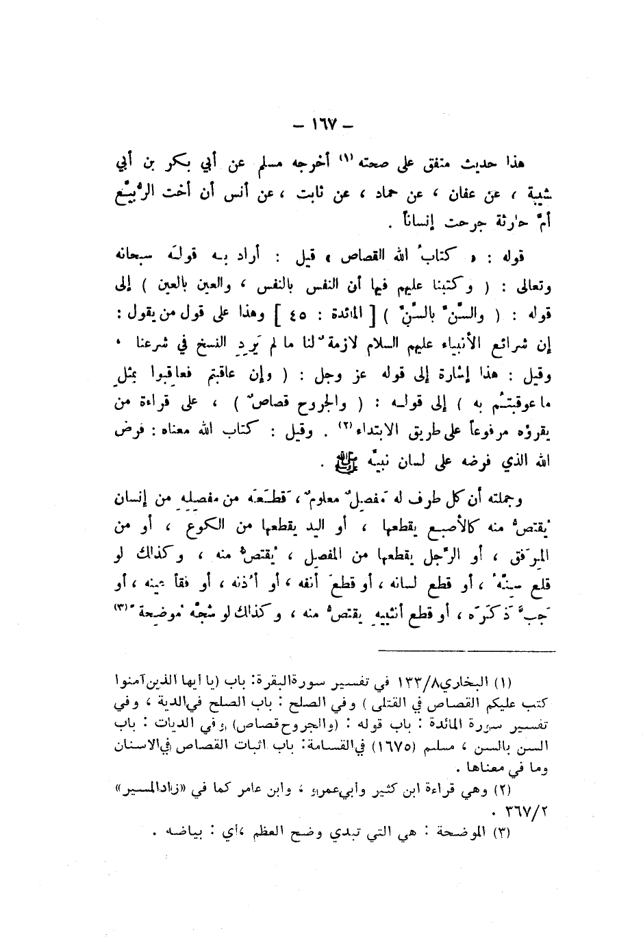 هَذَا حَدِيثٌ مُتَّفَقٌ عَلَى صِحَّتِهِ، أَخْرَجَهُ مُسْلِمٌ، عَنْ أَبِي بَكْرِ بْنِ أَبِي شَيْبَةَ، عَنْ عَفَّانَ، عَنْ حَمَّادٍ، عَنْ ثَابِتٍ، عَنْ أَنَسٍ، أَنَّ أُخْتَ الرُّبَيِّعِ أُمَّ حَارِثَةَ جَرَحَتْ إِنْسَانًا