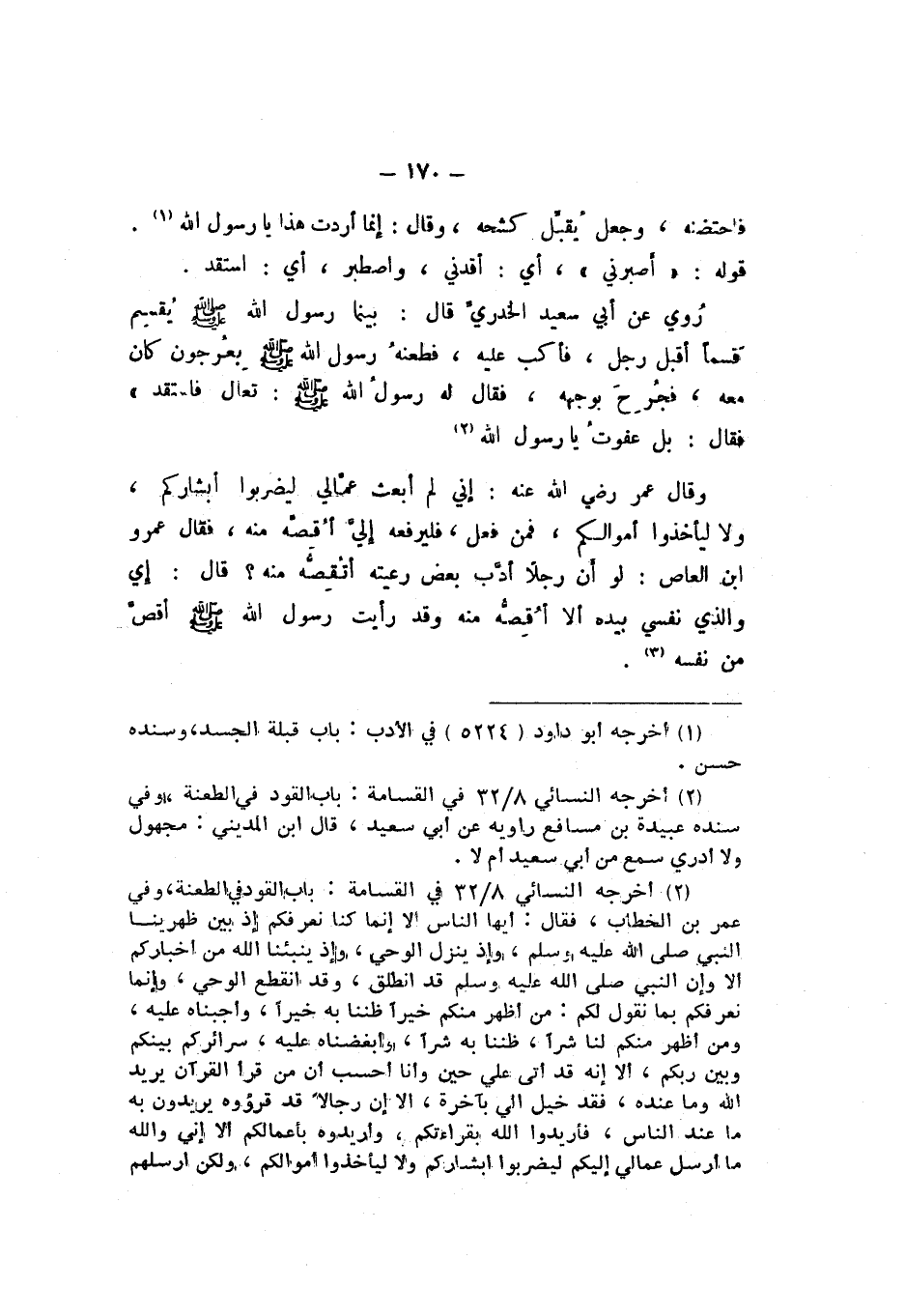 رُوِيَ عَنْ أَبِي سَعِيدٍ الْخُدْرِيِّ، قَالَ: بَيْنَما رَسُولُ اللَّهِ صَلَّى اللهُ عَلَيْهِ وَسَلَّمَ يَقْسِمُ قَسْمًا أَقْبَلَ رَجُلٌ، فَأَكَبَّ عَلَيْهِ، فَطَعَنَهُ رَسُولُ اللَّهِ صَلَّى اللهُ عَلَيْهِ وَسَلَّمَ بِعُرْجُونٍ كَانَ مَعَهُ، فَجُرِحَ بِوَجْهِهِ، فَقَالَ لَهُ رَسُولُ اللَّهِ صَلَّى اللهُ عَلَيْهِ وَسَلَّمَ: «تَعَالَ فَاسْتَقِدْ».
