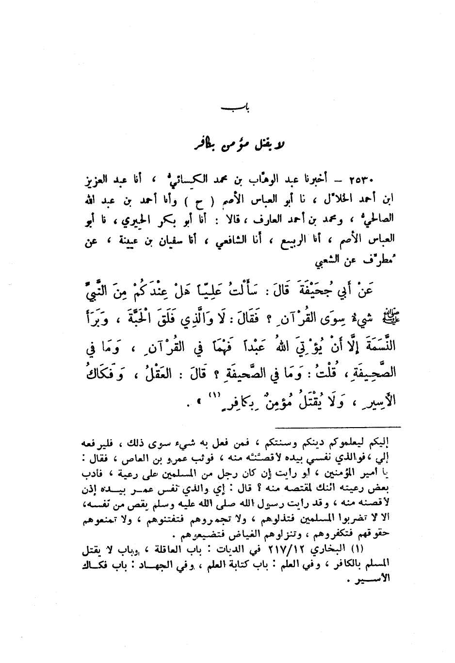 ح،، وَأَنا أَحْمَدُ بْنُ عَبْدِ اللَّهِ الصَّالِحِيُّ، وَمُحَمَّدُ بْنُ أَحْمَدَ الْعَارِفُ، قَالا: أَنا أَبُو بَكْرٍ الْحِيرِيُّ، نَا أَبُو الْعَبَّاسِ الأَصَمُّ، أَنا الرَّبِيعُ، أَنا الشَّافِعِيُّ، أَنا سُفْيَانُ بْنُ عُيَيْنَةَ، عَنْ مُطَرِّفٍ، عَنِ الشَّعْبِيِّ، عَنْ أَبِي جُحَيْفَةَ، قَالَ: سَأَلْتُ عَلِيًّا هَلْ عِنْدَكُمْ مِنَ النَّبيِّ صَلَّى اللهُ عَلَيْهِ وَسَلَّمَ شَيْءٌ سِوَى الْقُرْآنِ؟ فَقَالَ: " لَا وَالَّذي فَلَقَ الْحَبَّةَ، وَبَرَأَ النَّسَمَةَ إِلا أَنْ يُؤْتِيَ اللَّهُ عَبْدًا فَهْمًا فِي الْقُرْآنِ، وَمَا فِي الصَّحِيفَةِ، قُلْتُ: وَمَا فِي الصَّحِيفَةِ؟ قَالَ: «الْعَقْلُ، وَفَكَاكُ الأَسِيرِ، وَلا يُقْتَلُ مُؤمِنٌ بِكَافِرٍ».
