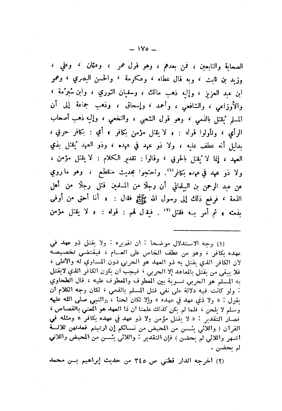 الصَّحَابَةِ وَالتَّابِعِينَ، فَمَنْ بَعْدَهُمْ، وَهُوَ قَوْلُ عُمَرَ، وَعُثْمَانَ، وَعَلِيٍّ، وَزَيْدِ بْنِ ثَابِتٍ، وَبِهِ قَالَ عَطَاءٌ، وَعِكْرِمَةُ، وَالْحَسَنُ الْبَصْرِيُّ، وَعُمَرُ بْنُ عَبْدِ الْعَزِيزِ، وَإِلَيْهِ ذَهَبَ مَالِكٌ، وَسُفْيَانُ الثَّوْرِيُّ، وَابْنُ شُبْرُمَةَ، وَالأَوْزَاعِيُّ، وَالشَّافِعِيُّ، وَأَحْمَدُ، وَإِسْحَاقُ، وَذَهَبَ جَمَاعَةٌ إِلَى أَنَّ الْمُسْلِمَ يُقْتَلُ بِالذِّمِّيِّ، وَهُوَ قَوْلُ الشَّعْبِيِّ، وَالنَّخَعِيُّ، وَإِلَيْهِ ذَهَبَ أَصْحَابُ الرَّأْيِ، وَتَأَوَّلُوا قَوْلَهُ: «لَا يُقْتَلُ مُؤْمِنٌ بِكَافِرٍ»، أَيْ: بِكَافِرِ حَرْبِيٍّ، بِدَلِيلِ أَنَّهُ عَطَفَ عَلَيْهِ «وَلا ذُو عَهْدٍ فِي عَهْدِهِ»، وَذُو الْعَهْدِ يُقْتَلُ بِذِي الْعَهْدِ، إِنَّمَا لَا يُقْتَلُ بِالْحَرْبِيِّ، وَقَالُوا: تَقْدِيرُ الْكَلامُ: لَا يُقْتَلُ مُؤْمِنٌ، وَلا ذُو عَهْدٍ فِي عَهْدِهِ بِكَافِرٍ.