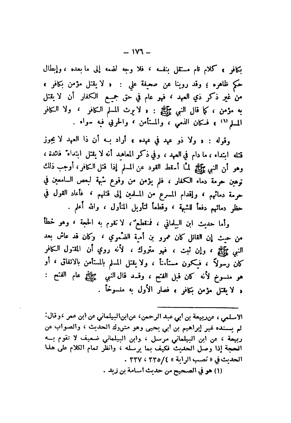 وَأَمَّا حَدِيثُ ابْنُ الْبَيْلَمَانِيِّ، فَمُنْقَطِعٌ، لَا تَقُومُ بِهِ الْحُجَّةُ، وَهُوَ خَطَأٌ مِنْ حَيْثُ إِنَّ الْقَاتِلَ كَانَ عَمْرَو بْنَ أُمَيَّةَ الضمرِي، وَكَانَ قَدْ عَاشَ بَعْدَ النَّبِيِّ صَلَّى اللهُ عَلَيْهِ وَسَلَّمَ، وَإِنْ ثَبَتَ فَهُوَ مَتْرُوكٌ، لأَنَّهُ رُوِيَ أَنَّ الْمَقْتُولَ الْكَافِرَ كَانَ رَسُولا، فَيَكُونُ مُسْتَأْمَنًا، وَلا يُقْتَلُ الْمُسْلِمُ بِالْمُسْتَأْمَنِ بِالاتِّفَاقِ، أَوْ هُوَ مَنْسُوخٌ، لأَنَّهُ كَانَ قَبْلَ الْفَتْحِ، وَقَدْ قَالَ النَّبِيُّ صَلَّى اللهُ عَلَيْهِ وَسَلَّمَ عَامَ الْفَتْحِ: «لَا يُقْتَلُ مُؤْمِنٌ بِكَافِرٍ»، فَصَارَ الأَوَّلُ بِهِ مَنْسُوخًا.