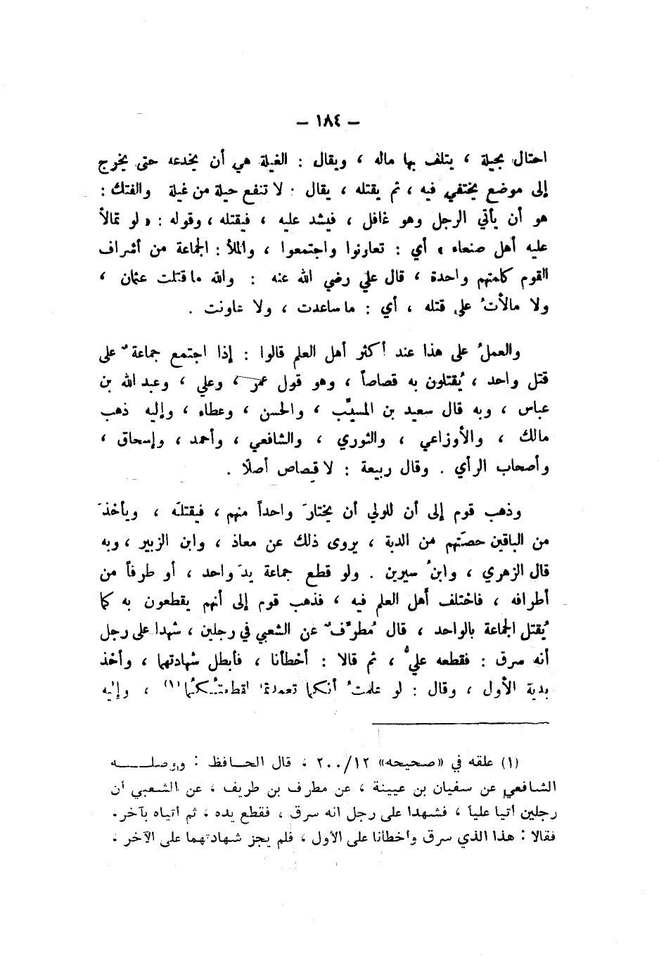 وَالْعَمَلُ عَلَى هَذَا عِنْدَ أَكْثَرِ أَهْلِ الْعِلْمِ، قَالُوا: إِذَا اجْتَمَعَ جَمَاعَةٌ عَلَى قَتْلِ وَاحِدٍ، يُقْتَلُونَ بِهِ قِصَاصًا، وَهُوَ قَوْلُ عُمَرَ، وَعَلِيٍّ، وَعَبْدِ اللَّهِ بْنِ عَبَّاسٍ، وَبِهِ قَالَ سَعِيدُ بْنُ الْمُسَيِّبِ، وَالْحَسَنُ، وَعَطَاءٌ، وَإِلَيْهِ ذَهَبَ مَالِكٌ، وَالأَوْزَاعِيُّ، وَالثَّوْرِيُّ، وَالشَّافِعِيُّ، وَأَحْمَدُ، وَإِسْحَاقُ، وَأَصْحَابُ الرَّأْيِ.