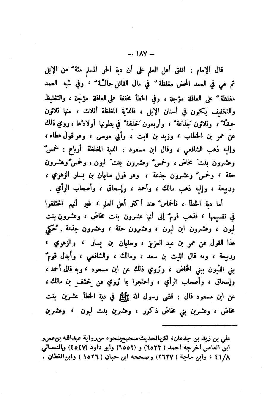 قَالَ الإِمَامُ: اتَّفَقَ أَهْلُ الْعِلْمِ عَلَى أَنَّ دِيَةِ الْحُرِّ الْمُسْلِمِ مِائَةٌ مِنَ الإِبِلِ ثُمَّ هِيَ فِي الْعَمْدِ الْمَحْضِ مُغَلَّظَةٌ فِي مَالِ الْقَاتِلِ حَالَّةٌ، وَفِي شِبْهِ الْعَمْدِ مُغَلَّظَةٌ عَلَى الْعَاقِلَةِ مُؤَجَّلَةٌ، وَفِي الْخَطَإِ مُخَفَّفَةٌ عَلَى الْعَاقِلَةِ مُؤَجَّلَةٌ، وَالتَّغْلِيظُ وَالتَّخْفِيفُ يَكُونُ فِي أَسْنَانِ الإِبِلِ، فَالدِّيَةُ الْمُغَلَّظَةُ أَثْلاثٌ، مِنْهَا ثَلاثُونَ حِقَّةً، وَثَلاثُونَ جَذَعَةً، وَأَرْبَعُونَ خِلْفَةً فِي بُطُونِهَا أَوْلادُهَا، رُوِيَ ذَلِكَ عَنْ عُمَرَ بْنِ الْخَطَّابِ، وَزَيْدِ بْنِ ثَابِتٍ، وَأَبِي مُوسَى، وَهُوَ قَوْلُ عَطَاءٍ، وَإِلَيْهِ ذَهَبَ الشَّافِعِيُّ، وَقَالَ ابْنُ مَسْعُودٍ: الدِّيَةُ الْمُغَلَّظَةُ أَرْبَاعٌ: خَمْسٌ وَعِشْرُونَ بِنْتَ مَخَاضٍ، وَخَمْسٌ وَعِشْرُونَ بِنْتَ لَبُونٍ، وَخَمْسٌ وَعِشْرُونَ حقَّةً، وَخَمْسٌ وَعِشْرُونَ جَذَعَةً، وَهُوَ قَوْلُ سُلَيْمَانَ بْنِ يَسَارٍ، وَالزُّهْرِيِّ، وَرَبِيعَةَ، وَإِلَيْهِ ذَهَبَ مَالِكٌ، وَأَحْمَدُ، وَإِسْحَاقُ، وَأَصْحَابُ الرَّأْيِ.