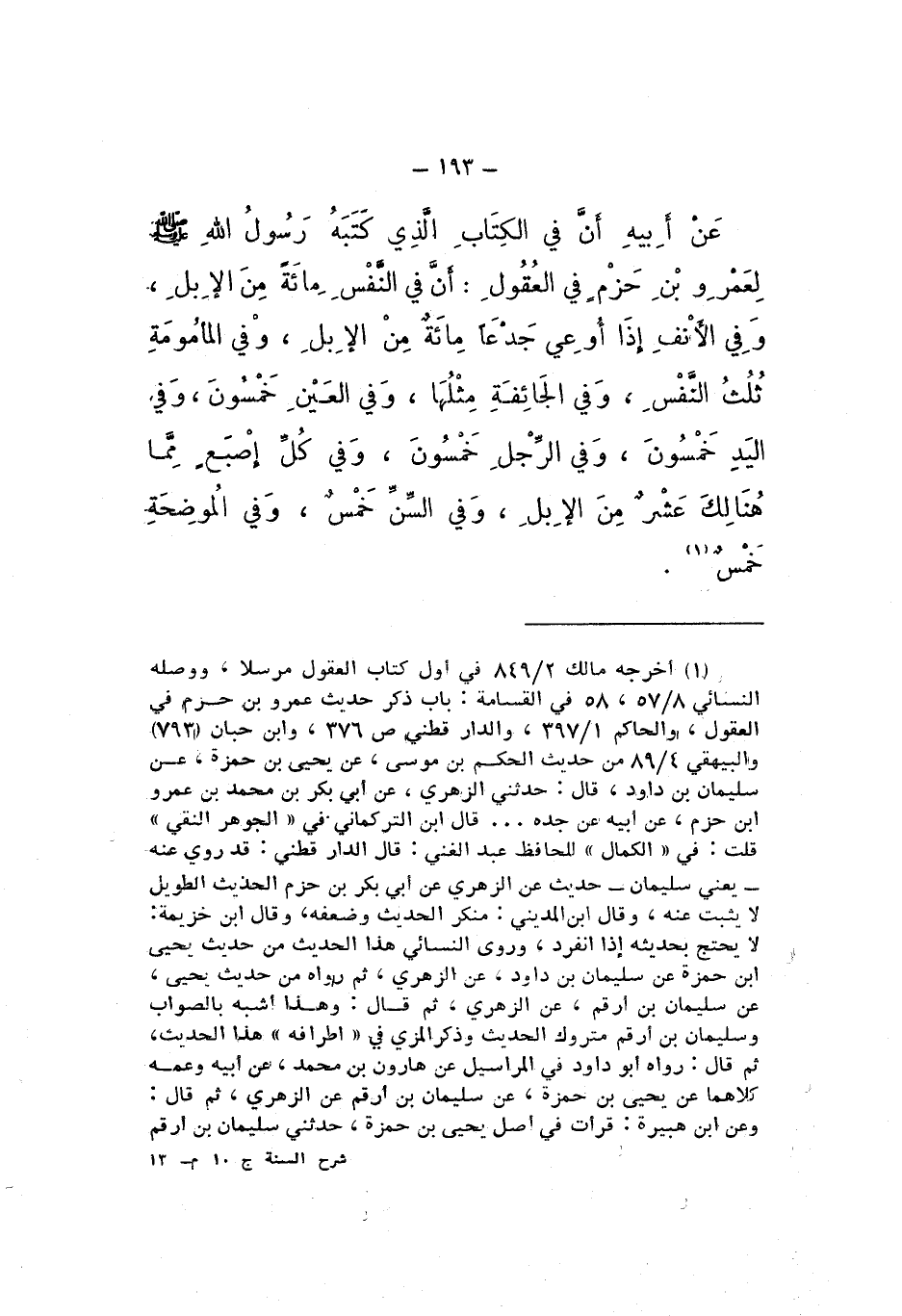 عَنْ أَبِيهِ، أَنَّ فِي الْكِتَابِ الَّذي كَتَبَهُ رَسُولُ اللَّهِ صَلَّى اللهُ عَلَيْهِ وَسَلَّمَ لِعَمْرِو بْنِ حَزْمٍ فِي الْعُقُولِ: «أَنَّ فِي النَّفسِ مِائَةً مِنَ الإِبِلِ، وَفِي الأَنْفِ إِذَا أُوعِيَ جَدْعًا مِائَةٌ مِنَ الإِبِلِ، وَفِي الْمَأْمُومَةِ ثُلُثُ النَّفْسِ، وَفِي الْجَائِفَةِ مِثْلُهَا، وَفِي الْعَيْنِ خَمْسُونَ، وَفِي الْيَدِ خَمْسُونَ، وَفِي الرِّجْلِ خَمْسُونَ، وَفِي كُلِّ إِصْبَعٍ ممَّا هُنَالِكَ عَشْرٌ مِنَ الإِبِلِ، وَفِي السِّنِّ خَمْسٌ، وَفِي الْمُوضِحَةِ خَمْسٌ»
