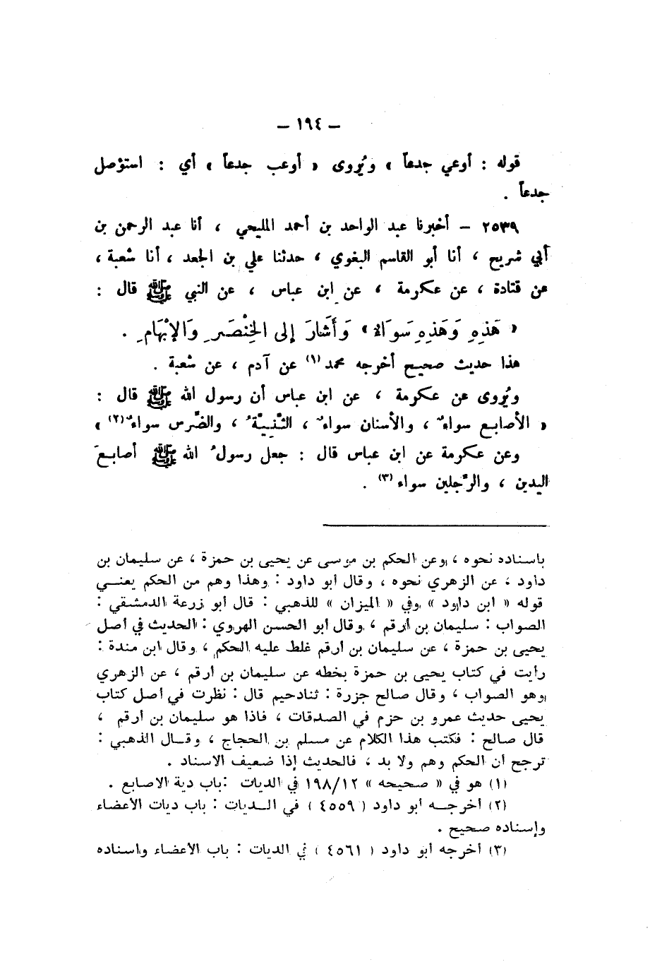 2539 - أَخْبَرَنَا عَبْدُ الْوَاحِدِ بْنُ أَحْمَدَ الْمَلِيحِيُّ، أَنا عَبْدُ الرَّحْمَنِ بْنُ أَبِي شُرَيْحٍ، أَنا أَبُو الْقَاسِمِ الْبَغَوِيُّ، حَدَّثَنَا عَلِيُّ بْنُ الْجَعْدِ، أَنا شُعْبَةُ، عَنْ قَتَادَةَ، عَنْ عِكْرِمَةَ، عَنِ ابْنِ عَبَّاسٍ، عَنِ النَّبِيِّ صَلَّى اللهُ عَلَيْهِ وَسَلَّمَ، قَالَ: «هَذِهِ وَهَذِهِ سَوَاءٌ» وَأَشَارَ إِلَى الْخِنْصَرِ وَالإِبْهَامِ.