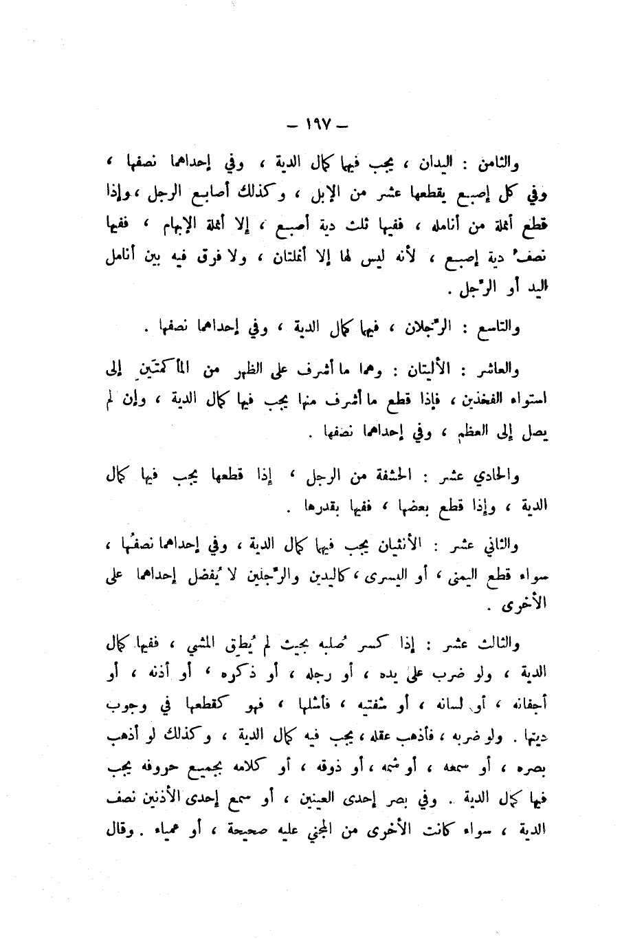 وَالثَّامِنُ: الْيَدَانِ، يَجِبُ فِيهِمَا كَمَالُ الدِّيَةِ، وَفِي إِحْدَاهُمَا نِصْفَهَا، وَفِي كُلِّ إِصْبَعٍ يَقْطَعُهَا عَشْرٌ مِنَ الإِبِلِ، وَكَذَلِكَ أَصَابِعُ الرِّجلِ، وَإِذَا قَطَعَ أُنْمُلَةً مِنْ أَنَامِلِهِ، فَفِيهَا ثُلُثُ دِيَةِ أُصْبُعٍ، إِلا أُنْمَلَةَ الإِبْهَامِ، فَفِيهَا نِصْفُ دِيَةِ إِصْبَعٍ، لأَنَّهُ لَيْسَ لَهَا إِلا أُنْمُلَتَانِ، وَلا فَرْقَ فِيهِ بَيْنَ أَنَامِلِ الْيَدِ أَوِ الرِّجْلِ.