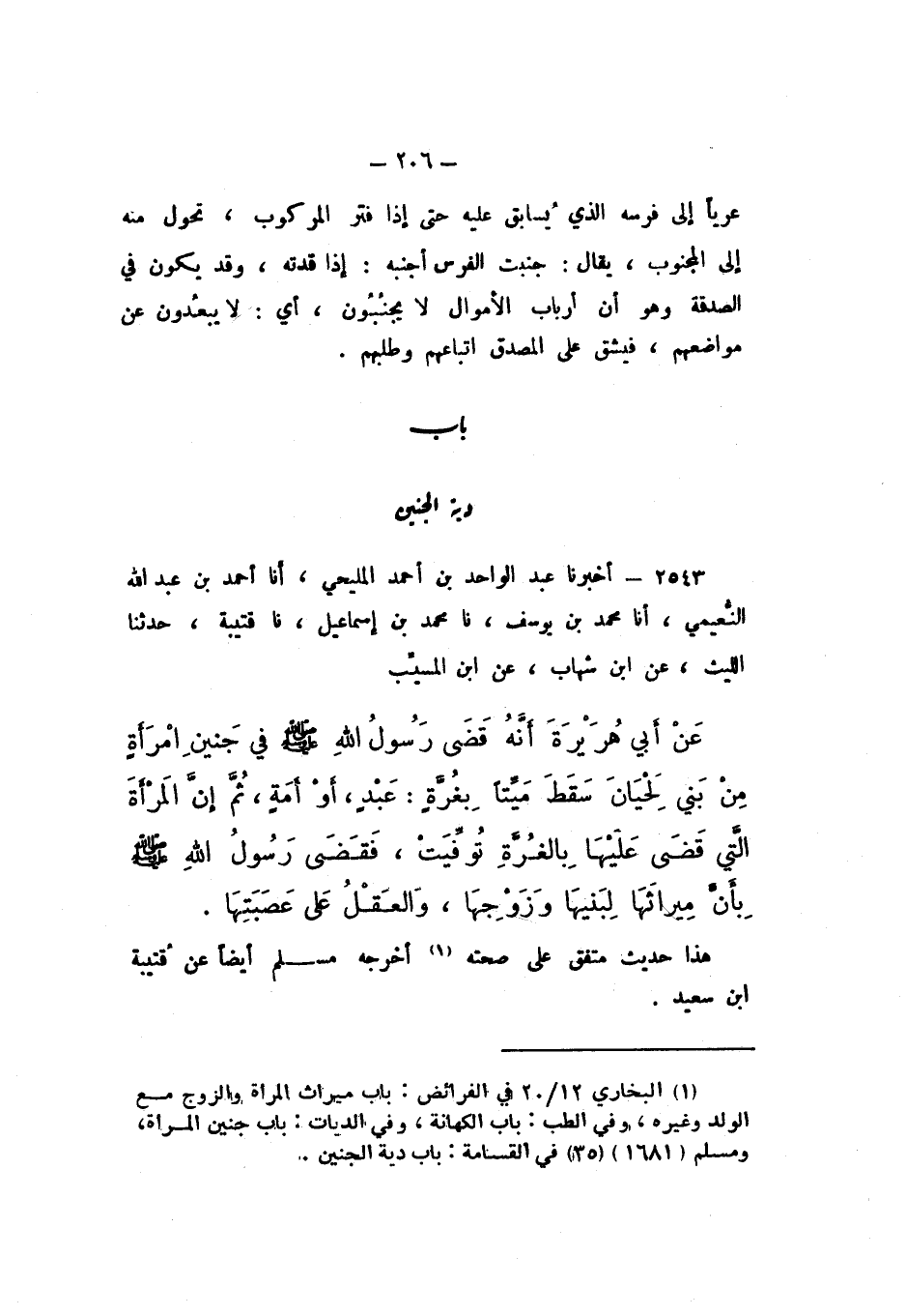 2543 - أَخْبَرَنَا عَبْدُ الْوَاحِدِ بْنُ أَحْمَدَ الْمَلِيحِيُّ، أَنا أَحْمَدُ بْنُ عَبْدِ اللَّهِ النُّعَيْمِيُّ، أَنا مُحَمَّدُ بْنُ يُوسُفَ، نَا مُحَمَّدُ بْنُ إِسْمَاعِيلَ، نَا قُتَيْبَةُ، حَدَّثَنَا اللَّيْثُ، عَنِ ابْنِ شِهَابٍ، عَنِ ابْنِ الْمُسَيِّبِ، عَنْ أَبِي هُرَيْرَةَ، أَنَّهُ " قَضَى رَسُولُ اللَّهِ صَلَّى اللهُ عَلَيْهِ وَسَلَّمَ فِي جَنِينِ امْرَأَةٍ مِنْ بَنِي لحْيَان سَقَطَ مَيِّتًا بِغُرَّةٍ: عَبْدٍ، أَوْ أَمَةٍ، ثمَّ إِنَّ الْمَرْأَةَ الَّتِي قَضَى عَلَيْهَا بِالْغُرَّةِ تُوُفِّيَتْ، فَقَضَى رَسُولُ اللَّهِ صَلَّى اللهُ عَلَيْهِ وَسَلَّمَ بِأَنَّ مِيرَاثَهَا لِبَنِيهَا وَزَوْجِهَا، وَالْعَقْلُ عَلَى عَصَبَتِهَا ".