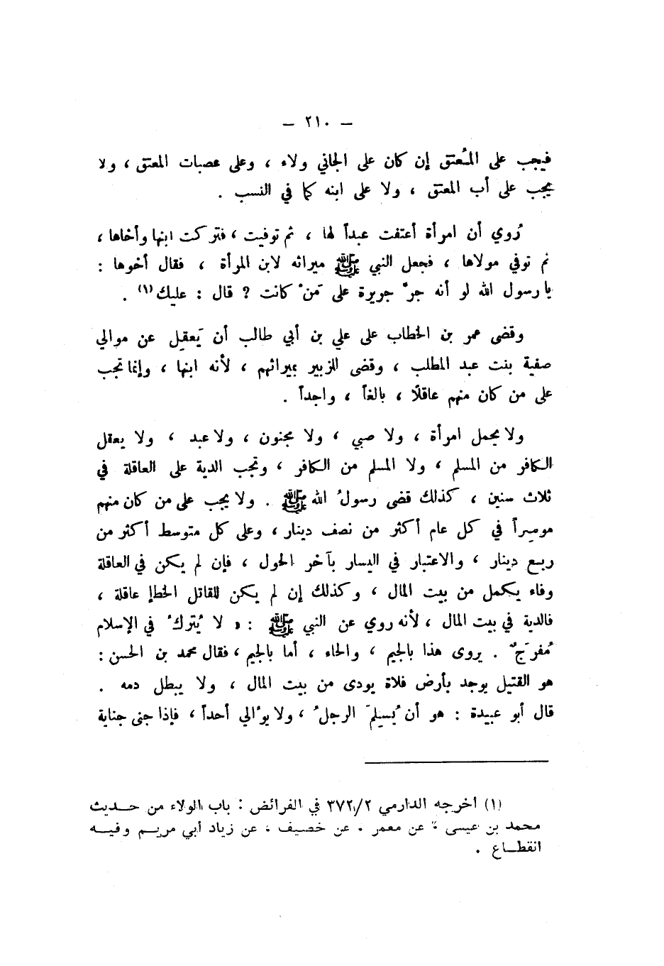 وَقَضَى عُمَرُ بْنُ الْخَطَّابِ عَلَى عَلِيِّ بْنِ أَبِي طَالِبٍ أَنْ يَعْقِلَ عَنْ مَوَالِي صَفِيَّةَ بِنْتِ عَبْدِ الْمُطَّلِبِ، وَقَضَى لِلزُّبَيْرِ بِمِيرَاثِهِمْ، لأَنَّهُ ابْنُهَا، وَإِنَّمَا تَجِبُ عَلَى مَنْ كَانَ مِنْهُمْ عَاقِلا، بَالِغًا، وَاجِدًا.
