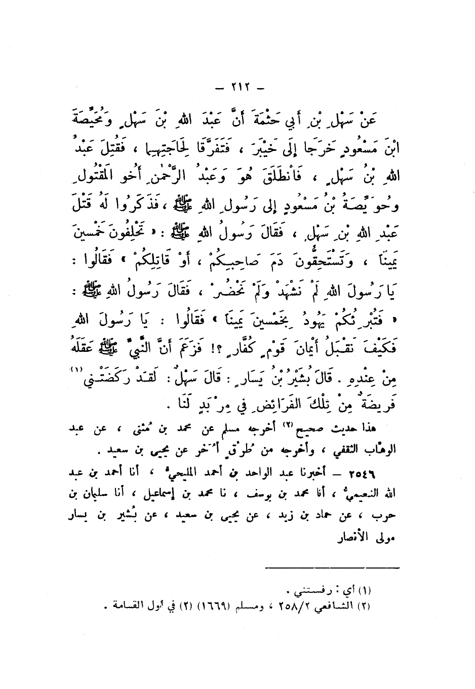 عَنْ سَهْلِ بْنِ أَبِي حَثْمَةَ، أَنَّ عَبْدَ اللَّهِ بْنَ سَهْلٍ، وَمُحَيِّصَةَ بْنَ مَسْعُودٍ خَرَجَا إِلَى خَيْبَرَ، فَتَفَرَّقَا لِحَاجَتِهِمَا، فَقُتِلَ عَبْدُ اللَّهِ بْنُ سَهْلٍ، فَانْطَلَقَ هُوَ وَعَبْدُ الرَّحْمَنِ أَخُو الْمَقْتُولِ وَحُوَيِّصَةُ بْنُ مَسْعُودٍ إِلَى رَسُولِ اللَّهِ صَلَّى اللهُ عَلَيْهِ وَسَلَّمَ، فَذَكَرُوا لَهُ قَتْلَ عَبْدِ اللَّهِ بْنِ سَهْلٍ، فَقَالَ رَسُولُ اللَّهِ صَلَّى اللهُ عَلَيْهِ وَسَلَّمَ: «تَحْلِفُونَ خَمْسِينَ يَمِينًا، وَتَسْتَحِقُّونَ دَمَ صَاحِبِكُمْ، أَوْ قَاتِلِكُمْ»، فقالُوا: يَا رَسُولَ اللَّهِ، لَمْ نَشْهَدْ وَلَمْ نَحْضُرْ.