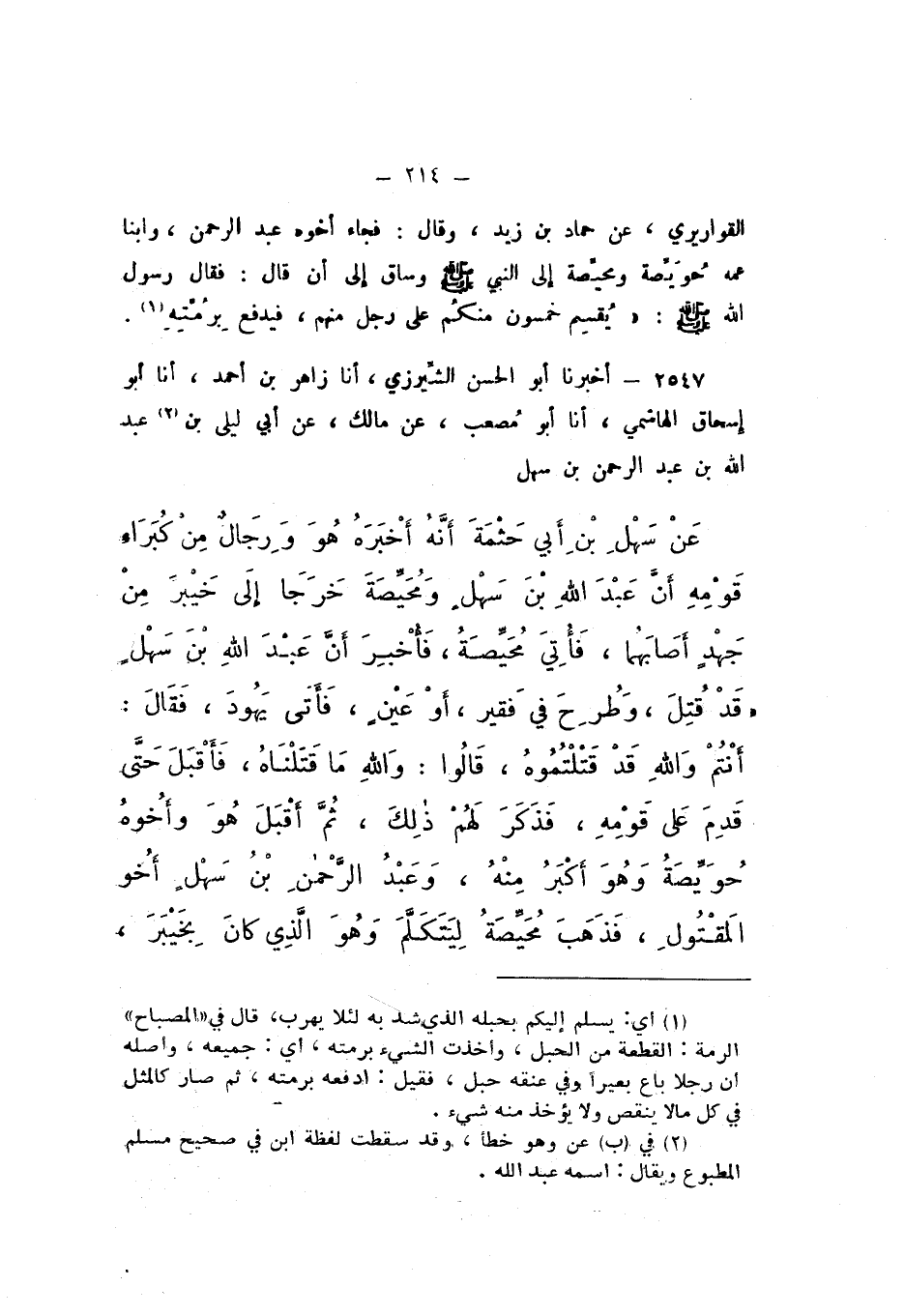2547 - أَخْبَرَنَا أَبُو الْحَسَنِ الشِّيرَزِيُّ، أَنا زَاهِرُ بْنُ أَحْمَدَ، أَنا أَبُو إِسْحَاقَ الْهَاشِمِيُّ، أَنا أَبُو مُصْعَبٍ، عَنْ مَالِكٍ، عَنْ أَبِي لَيْلَى بْنِ عَبْدِ اللَّهِ بْنِ عَبْدِ الرَّحْمَنِ بْنِ سَهْلٍ، عَنْ سَهْلِ بْنِ أَبِي حَثْمَةَ، أَنَّه أَخْبَرَهُ هُوَ وَرِجَالٌ مِنْ كُبَرَاءِ قَوْمِهِ، أَنَّ عَبْدَ اللَّهِ بْنَ سَهْلٍ، وَمُحَيِّصَةَ خَرَجَا إِلَى خَيْبَرَ مِنْ جَهْدٍ أَصَابَهُمَا، فَأُتِيَ مُحَيِّصَةُ، فَأُخْبِرَ أَنَّ عَبْدَ اللَّهِ بْنَ سَهْلٍ قَدْ قُتِلَ، وَطُرِحَ فِي فَقِيرٍ، أَوْ عَيْنٍ، فَأَتَى يَهُودَ، فَقَالَ: أَنْتُمْ وَاللَّهِ قَدْ قَتلْتُمُوهُ، قَالُوا: وَاللَّهِ مَا قَتَلْنَاهُ، فَأَقْبَلَ حتَّى قَدِمَ عَلَى قَوْمِهِ، فَذَكَرَ لَهُمْ ذَلِكَ، ثمَّ أَقْبَلَ هُوَ وَأَخُوهُ حُوَيِّصَةُ وَهُوَ أَكْبَرُ مِنْهُ، وَعَبْدُ الرَّحْمَنِ بْنُ سَهْلٍ أَخُو الْمَقْتُولِ، فَذَهَبَ مُحَيِّصَةُ لِيَتَكَلَّمَ وَهُوَ الَّذِي كَانَ بِخَيْبَرَ،
