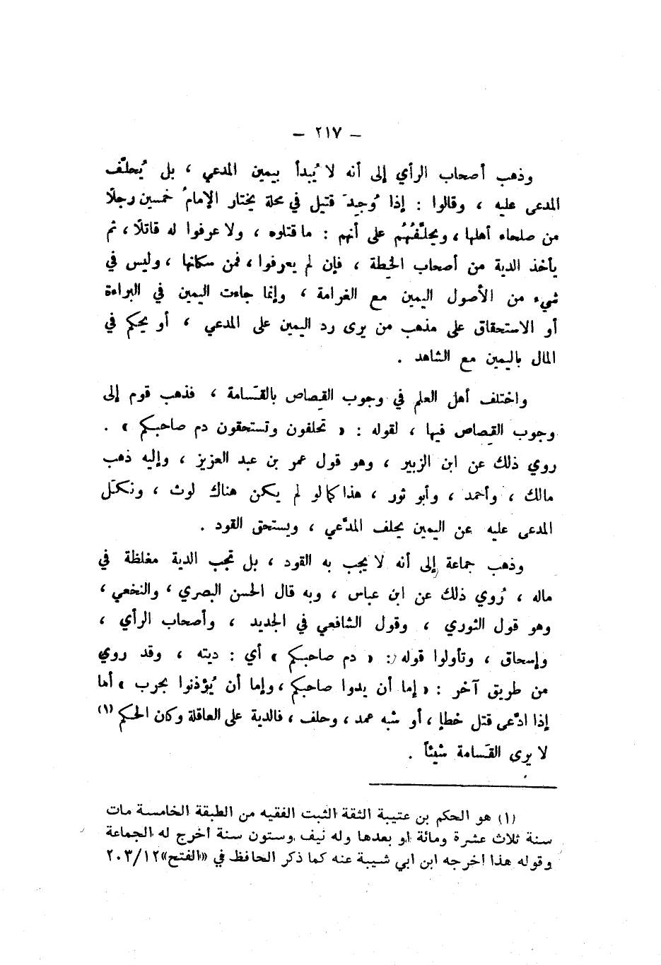 وَذَهَبَ جَمَاعَةٌ إِلَى أَنَّهُ لَا يَجِبُ بِهِ الْقَوَدُ، بَلْ تَجِبُ الدِّيَةُ مُغَلَّظَةٌ فِي مَالِهِ، رُوِيَ ذَلِكَ عَنِ ابْنِ عَبَّاسٍ، وَبِهِ قَالَ الْحَسَنُ الْبَصْرِيُّ، وَالنَّخَعِيُّ، وَهُوَ قَوْلُ الثَّوْرِيِّ، وَقَوْلُ الشَّافِعِيِّ فِي الْجَدِيدِ، وَأَصْحَابِ الرَّأْيِ، وَإِسْحَاقَ، وَتَأَوَّلُوا قَوْلَهُ: «دَمَ صَاحِبِكُمْ» أَيْ: دِيَتُهُ، وَقَدْ رُوِيَ مِنْ طَرِيقٍ آخَرَ: «إِمَّا أَنْ يَدُوا صَاحِبَكُمْ، وَإِمَّا أَنْ يُؤْذِنُوا بِحَرْبٍ»، أَمَّا إِذَا ادَّعَى قَتْلَ خَطَإٍ، أَوْ شِبْهَ عَمْدٍ، وَحَلَفَ، فَالدِّيَةُ عَلَى الْعَاقِلَةِ، وَكَانَ الْحَكَمُ لَا يَرَى الْقَسَامَةَ شَيْئًا.