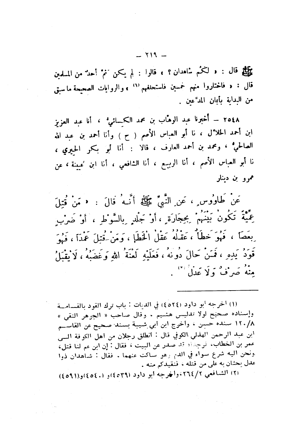 ح، وَأَنا أَحْمَدُ بْنُ عَبْدِ اللَّهِ الصَّالِحِيُّ، وَمُحَمَّدُ بْنُ أَحْمَدَ الْعَارِفُ، قَالا: أَنا أَبُو بَكْرٍ الْحِيرِيُّ، نَا أَبُو الْعَبَّاسِ الأَصَمُّ، أَنا الرَّبِيعُ، أَنا الشَّافِعِيُّ، أَنا ابْنُ عُيَيْنَةَ، عَنْ عَمْرِو بْنِ دِينَارٍ، عَنْ طَاوُسٍ، عَنِ النَّبِيِّ صَلَّى اللهُ عَلَيْهِ وَسَلَّمَ، أَنَّهُ قَالَ: «مَنْ قُتِلَ عميةً تَكُونُ بَيْنَهُمْ بِحِجَارَةٍ، أَوْ جَلْدٍ بِالسَّوْطِ، أَوْ ضَرْبٍ بِعَصَا، فَهُوَ خَطَأٌ، عَقْلُهُ عَقْلُ الْخَطَإِ، وَمَنْ قُتِلَ عَمْدًا، فَهُوَ قَوَدُ يَدِهِ، فَمَنْ حَالَ دُونَهُ، فَعَلَيْهِ لَعْنَةُ اللَّهِ وَغَضَبُهُ، لَا يُقْبَلُ مِنْهُ صَرْفٌ وَلا عَدْلٌ».