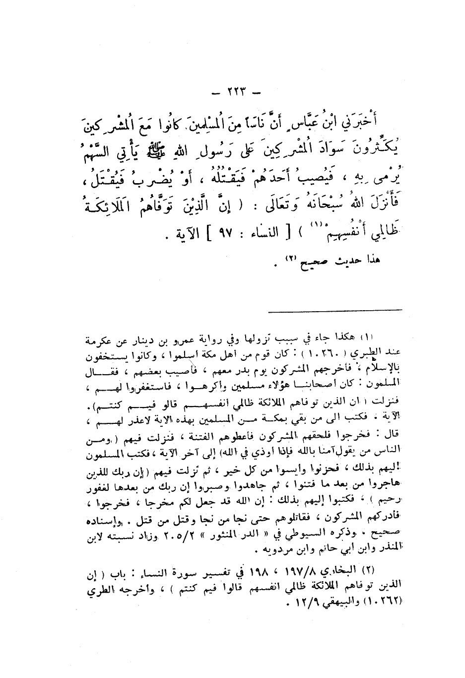 أَخْبَرَنِي ابْنُ عبَّاسٍ: " أَنَّ نَاسًا مِنَ الْمُسْلِمِينَ كَانُوا مَعَ الْمُشْرِكِينَ يُكَثِّرونُ سَوَادَ الْمُشْرِكِينَ عَلَى رَسُولِ اللَّهِ صَلَّى اللهُ عَلَيْهِ وَسَلَّمَ يَأْتِي السَّهْمُ يُرْمَى بِهِ، فَيُصِيبُ أَحَدَهُمْ فَيَقْتُلُهُ، أَوْ يُضْرَبُ فَيُقْتَلُ، فَأَنْزَلَ اللَّهُ سُبْحَانَهُ وَتَعَالَى: {إِنَّ الَّذِينَ تَوَفَّاهُمُ الْمَلائِكَةُ ظَالِمِي أَنْفُسِهِمْ} [النِّسَاء: 97] الآيَةَ ".