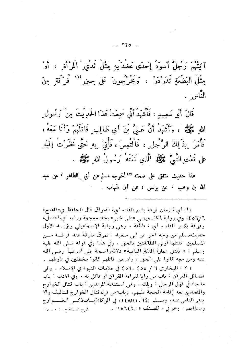 قَالَ أَبُو سَعِيدٍ: فَأَشْهَدُ أَنِّي سَمِعْتُ هَذَا الْحَدِيثَ مِنْ رَسُولِ اللَّهِ صَلَّى اللهُ عَلَيْهِ وَسَلَّمَ، وَأَشْهَدُ أَنَّ عَلِيَّ بْنَ أَبي طَالِبٍ قَاتَلَهُمْ وَأَنَا مَعَهُ، فَأَمَرَ بِذَلِكَ الرَّجُلِ، فَالْتُمِسَ، فَأُتِيَ بِهِ حتَّى نَظَرْتُ إِلَيْهِ عَلَى نَعْتِ النَّبيِّ صَلَّى اللهُ عَلَيْهِ وَسَلَّمَ الَّذِي نَعَتَهُ رَسُولُ اللَّهِ صَلَّى اللهُ عَلَيْهِ وَسَلَّمَ.