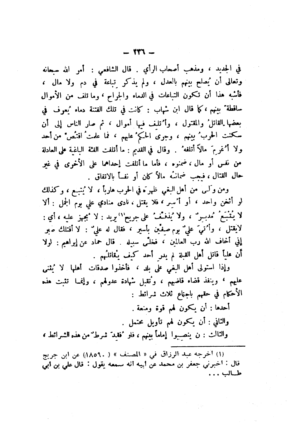 قَالَ الشَّافِعِيُّ: أَمَرَ اللَّهُ سُبْحَانَهُ وَتَعَالَى أَنْ يُصْلَحَ بَيْنَهُمْ بِالْعَدْلِ، وَلَمْ يَذْكُرْ تِبَاعَةً فِي دَمٍ وَلا مَالٍ، فَأَشْبَهُ هَذَا أَنْ تَكُونَ التِّبَاعَاتِ فِي الدِّمَاءِ وَالْجِرَاحِ، وَمَا تَلِفَ مِنَ الأَمْوَالِ سَاقِطَةً بَيْنَهُمْ، كَمَا قَالَ ابْنُ شِهَابٍ: كَانَتْ فِي تِلْكَ الْفِتْنَةِ دِمَاءٌ يُعْرَفُ فِي بَعْضِهَا الْقَاتِلُ وَالْمَقْتُولُ، وَأُتْلِفَ فِيهَا أَمْوَالٌ، ثُمَّ صَارَ النَّاسُ إِلَى أَنْ سَكَنَتِ الْحَرْبُ بَيْنَهُمْ، وَجَرَى الْحُكْمُ عَلَيْهِمْ، فَمَا عَلِمْتُ اقْتُصَّ مِنْ أَحَدٍ وَلا أُغْرِمَ مَالا أَتْلَفَهُ.