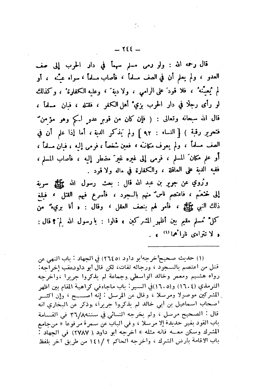 قَالَ رَحِمَهُ اللَّهُ: وَلَوْ رَمَى مُسْلِمٌ سَهْمًا فِي دَارِ الْحَرْبِ إِلَى صَفِّ الْعَدُوِّ، وَلَمْ يَعْلَمْ أَنَّ فِي الصَّفِ مُسْلِمًا، فَأَصَابَ مُسْلِمًا، سَوَاءٌ عَيَّنَهُ، أَوْ لَمْ يُعَيِّنْهُ، فَلا قَوَدَ عَلَى الرَّامِي، وَلا دِيَةَ، وَعَلَيْهِ الْكَفَّارَةُ، وَكَذَلِكَ لَوْ رَأَى رَجُلا فِي دَارِ الْحَرْبِ بِزِيِّ أَهْلِ الْكُفْرِ، فَقَتَلَهُ، فَبَانَ مُسْلِمًا، قَالَ اللَّهُ سُبْحَانَهُ وَتَعَالَى: {فَإِنْ كَانَ مِنْ قَوْمٍ عَدُوٍّ لَكُمْ وَهُوَ مُؤْمِنٌ فَتَحْرِيرُ رَقَبَةٍ} [النِّسَاء: 92] وَلَمْ يَذْكُرِ الدِّيَةَ، أَمَّا إِذَا عَلِمَ أَنَّ فِي الصَّفِّ مُسْلِمًا، وَلَمْ يَعْرِفْ مَكَانَهُ، فَعَيَّنَ شَخْصًا، فَرَمَى إِلَيْهِ، فَبَانَ مُسْلِمًا، أَوْ عَلِمَ مَكَانَ الْمُسْلِمِ، فَرَمَى إِلَى غَيْرِهِ غَيْرَ مُضْطَرٍّ إِلَيْهِ، فَأَصَابَ الْمُسْلِمَ، فَفِيهِ الدِّيَةُ عَلَى الْعَاقِلَةِ، وَالْكَفَّارَةُ فِي مَالِهِ وَلا قَوَدَ.