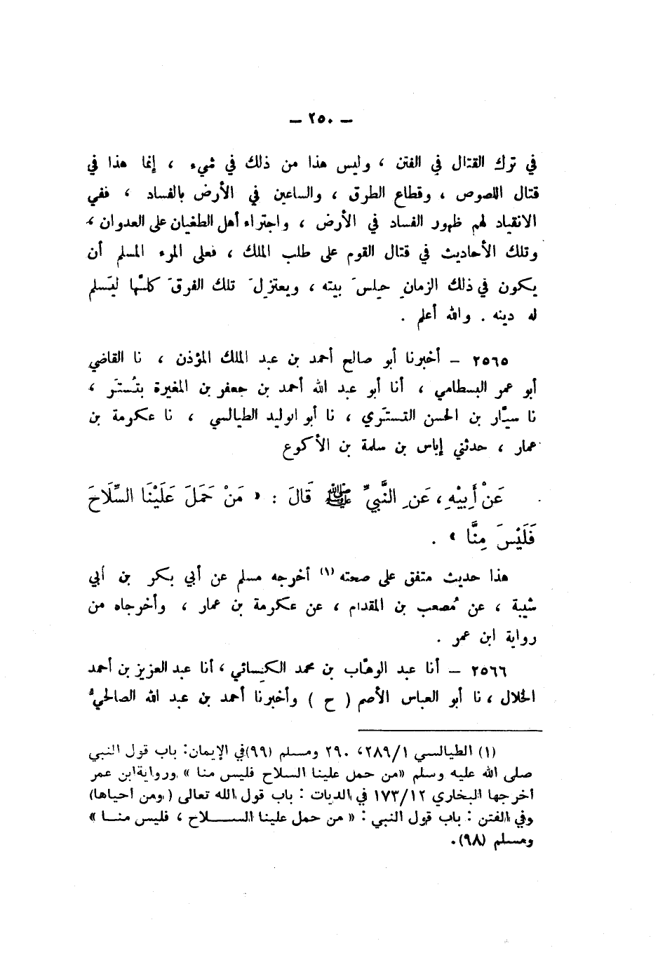 2565 - أَخْبَرَنَا أَبُو صَالِحٍ أَحْمَدُ بْنُ عَبْدِ الْمَلِكِ الْمُؤَذِّنُ، نَا الْقَاضِي أَبُو عُمَرَ الْبَسْطَامِيُّ، أَنا أَبُو عَبْدِ اللَّهِ بْنُ جَعْفَرِ بْنِ الْمُغِيرَةِ بِتُسْتَرَ، نَا سَيَّارُ بْنُ الْحَسَنِ التُّسْتَرِيُّ، نَا أَبُو الْوَلِيدِ الطَّيَالِسِيُّ، نَا عِكْرِمَةُ بْنُ عَمَّارٍ، حَدَّثَنِي أياس بْنُ سَلَمَةَ بْنِ الأَكْوَعِ، عَنْ أَبِيهِ، عَنِ النَّبيِّ صَلَّى اللهُ عَلَيْهِ وَسَلَّمَ، قَالَ: «مَنْ حَمَلَ عَلَيْنَا السِّلاحَ فَلَيْسَ مِنَّا».