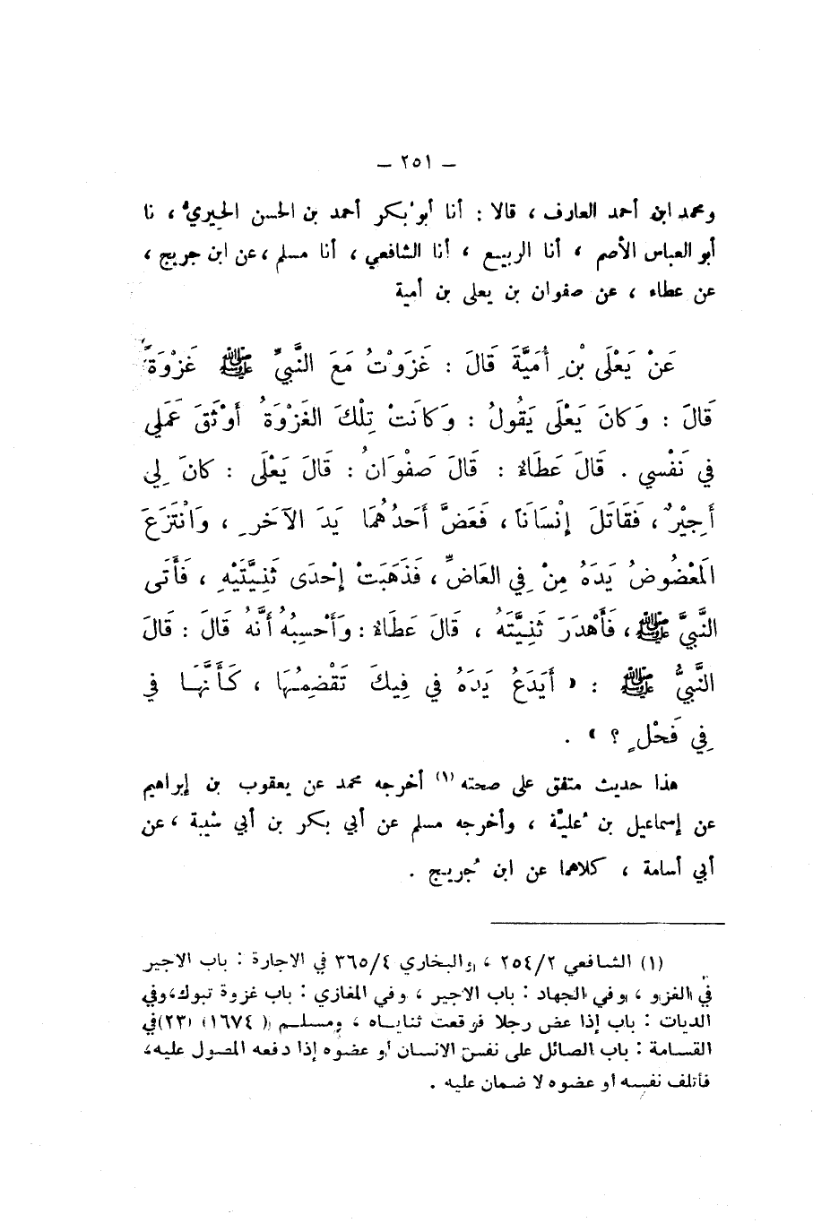 وَمُحَمَّدُ بْنُ أَحْمَدَ الْعَارِفُ، قَالا: أَنا أَبُو بَكْرٍ أَحْمَدُ بْنُ الْحَسَنِ الْحِيرِيُّ، نَا أَبُو الْعَبَّاسِ الأَصَمُّ، أَنا الرَّبِيعُ، أَنا الشَّافِعِيُّ، أَنا مُسْلِمٌ، عَنِ ابْنِ جُرَيْجٍ، عَنْ عَطَاءٍ، عَنْ صَفْوَانَ بْنِ يَعْلَى بْنِ أُمَيَّةَ، عَنْ يَعْلَى بْنِ أُمَيَّةَ، قَالَ: غَزَوْتَ مَعَ النَّبيِّ صَلَّى اللهُ عَلَيْهِ وَسَلَّمَ غَزْوَةً، قَالَ: وَكَانَ يَعْلَى يَقُولُ: وَكَانَتْ تِلْكَ الغَزْوَةُ أَوْثَقَ عَمَلِي فِي نَفْسِي.