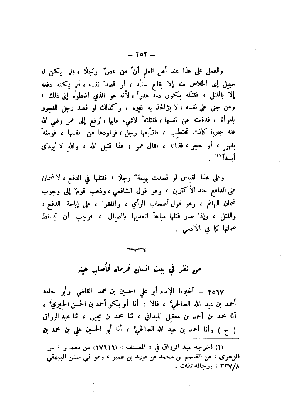 وَالْعَمَلُ عَلَى هَذَا عِنْدَ أَهْلِ الْعِلْمِ أَنَّ مَنْ عَضَّ رَجُلا، فَلَمْ يَكُنْ لَهُ سَبِيلٌ إِلَى الْخَلاصِ مِنْهُ إِلا بِقَلْعِ سِنِّهِ، أَوْ قَصَدَ نَفْسَهُ، فَلَمْ يُمْكِنْهُ دَفْعهُ إِلا بِالْقَتْلِ، فَقَتَلَهُ، يَكُونُ دَمُهُ هَدَرًا، لأَنَّهُ هُوَ الَّذِي اضْطَرَّهُ إِلَى ذَلِكَ، وَمَنْ جَنَى عَلَى نَفْسِهِ، لَا يُؤَاخِذُ بِهَا غَيْرُهُ، وَكَذَلِكَ لَوْ قَصَدَ رَجُلٌ الْفُجُورَ بِامْرَأَةٍ، فَدَفَعَتْهُ عَنْ نَفْسِهَا، فَقَتَلَتْهُ لَا شَيْءَ عَلَيْهَا، رُفِعَ إِلَى عُمَرَ رَضِيَ اللَّهُ عَنْهُ جَارِيَةً كَانَتْ تَحْتَطِبُ، فَاتَّبَعَهَا رَجُلٌ، فَرَاوَدَهَا عَنْ نَفْسِهَا، فَرَمَتْهُ بِفِهْرٍ، أَوْ حَجَرٍ فَقَتَلَتْهُ، فَقَالَ عُمَرُ: «هَذَا قَتِيلُ اللَّهِ، وَاللَّهِ لَا يُودَى أَبَدًا».