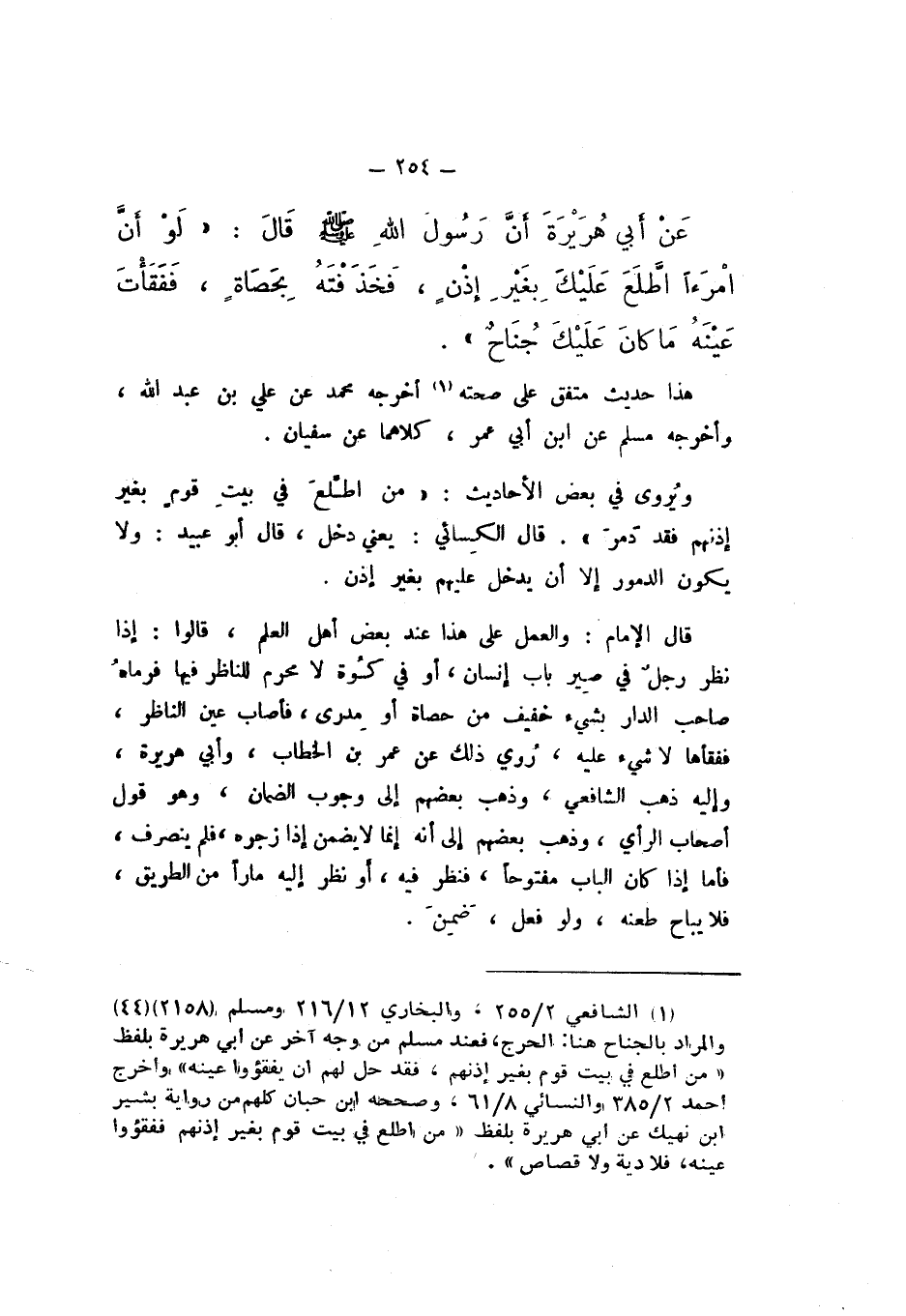 قَالَ الإِمَامُ: وَالْعَمَلُ عَلَى هَذَا عِنْدَ بَعْضِ أَهْلِ الْعِلْمِ، قَالُوا: إِذَا نَظَرَ رَجُلٌ فِي صِيرِ بَابِ إِنْسَانٍ، أَوْ فِي كُوَّةٍ لَا مَحْرَمَ لِلنَّاظِرِ فِيهَا فَرَمَاهُ صَاحِبُ الدَّارِ بِشَيْءٍ خَفِيفٍ مِنْ حَصَاةٍ أَوْ مِدْرًى، فَأَصَابَ عَيْنَ النَّاظِرِ، فَفَقَأَهَا لَا شَيْءَ عَلَيْهِ، رُوِيَ ذَلِكَ عَنْ عُمَرَ بْنِ الْخَطَّابِ، وَأَبِي هُرَيْرَةَ، وَإِلَيْهِ ذَهَبَ الشَّافِعِيُّ، وَذَهَبَ بَعْضُهُمْ إِلَى وُجُوبِ الضَّمَانِ، وَهُوَ قَوْلُ أَصْحَابِ الرَّأْيِ، وَذَهَبَ بَعْضُهُمْ إِلَى أَنَّهُ إِنَّمَا لَا يَضْمَنُ إِذَا زَجَرَهُ، فَلَمْ يَنْصَرِفْ، فَأَمَّا إِذَا كَانَ الْبَابُ مَفْتُوحًا، فَنَظَرَ فِيهِ، أَوْ نَظَرَ إِلَيْهِ مَارًّا مِنَ الطَّرِيقِ، فَلا يُبَاحُ طَعْنُهُ، وَلَوْ فَعَلَ ضَمِنَ.