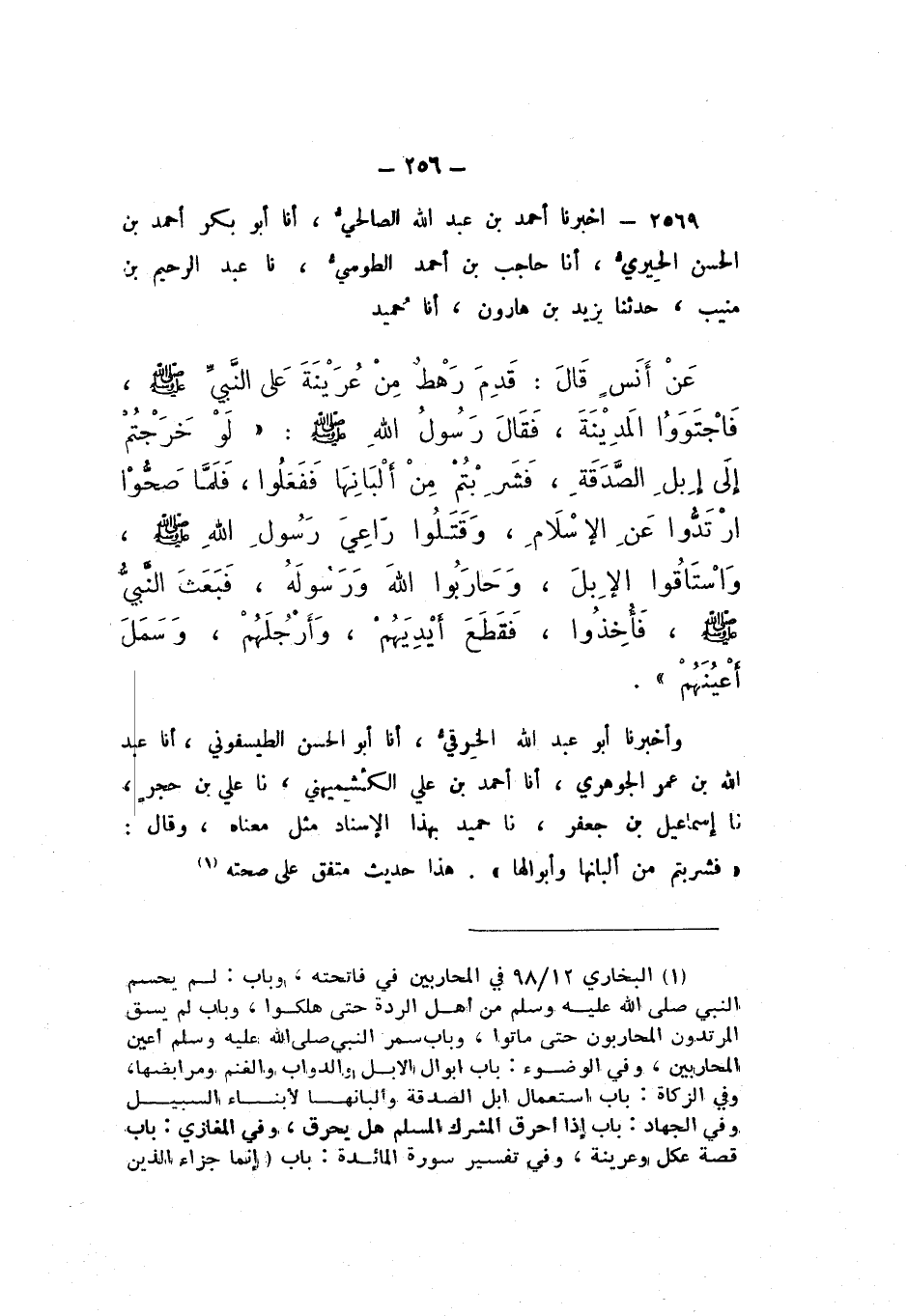 2569 - أَخْبَرَنَا أَحْمَدُ بْنُ عَبْدِ اللَّهِ الصَّالِحِيُّ، أَنا أَبُو بَكْرٍ أَحْمَدُ بْنُ الْحَسَنِ الْحِيرِيُّ، أَنا حَاجِبُ بْنُ أَحْمَدَ الطُّوسِيُّ، نَا عَبْدُ الرَّحِيمِ بْنُ مُنِيبٍ، حَدَّثَنَا يَزِيدُ بْنُ هَارُونَ، أَنا حُمَيْدٌ، عَنْ أَنَسٍ، قَالَ: قَدِمَ رَهْطٌ مِنْ عُرَيْنَةَ عَلَى النَّبيِّ صَلَّى اللهُ عَلَيْهِ وَسَلَّمَ، فَاجْتَوَوُا الْمَدِينَةَ، فَقَالَ رَسُولُ اللَّهِ صَلَّى اللهُ عَلَيْهِ وَسَلَّمَ: «لَوْ خَرَجْتُمْ إِلَى إبِلِ الصَّدَقَةِ، فَشَرِبْتُمْ مِنْ أَلْبَانِهَا» فَفَعَلُوا، فَلَمَّا صَحُّوا ارْتَدُّوا عَنِ الإسْلامِ، وَقَتَلُوا رَاعِيَ رَسُولِ اللَّه صَلَّى اللهُ عَلَيْهِ وَسَلَّمَ، وَاسْتَاقُوا الإِبِلَ، وَحَارَبُوا اللَّهَ وَرَسُولَهُ، فَبَعَثَ النَّبيُّ صَلَّى اللهُ عَلَيْهِ وَسَلَّمَ، فَأُخِذُوا، فَقَطَعَ أَيْدِيَهُمْ، وَأَرْجُلَهُمْ، وَسَمَلَ أَعْيُنَهُمْ.