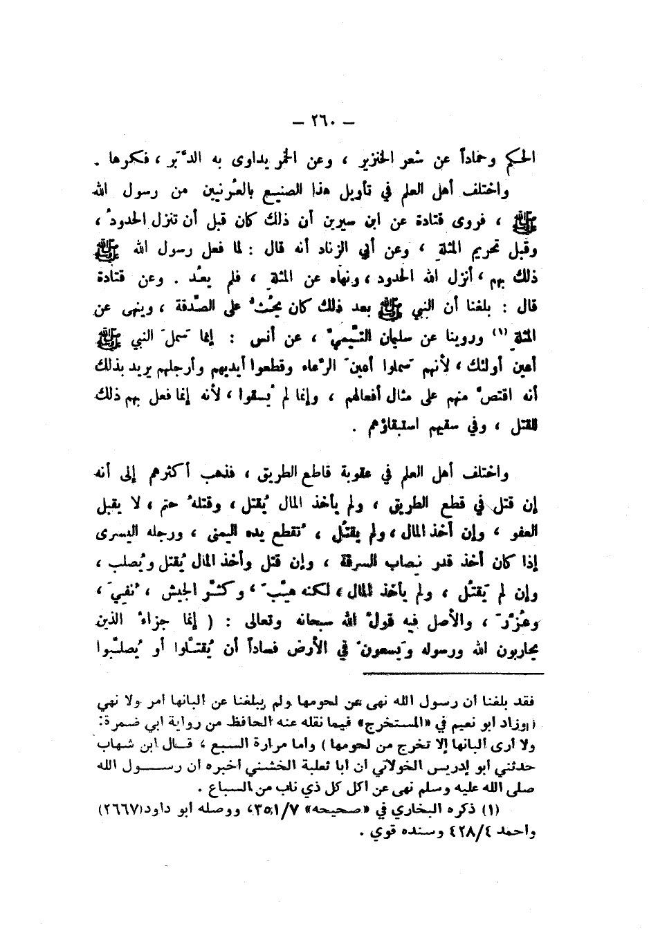 وَاخْتَلَفَ أَهْلُ الْعِلْمِ فِي عُقُوبَةِ قَاطِعِ الطَّرِيقِ، فَذَهَبَ أَكْثَرُهُمْ إِلَى أَنَّهُ إِنْ قَتَلَ فِي قَطْعِ الطَّرِيقِ، وَلَمْ يَأْخُذِ الْمَالَ يُقْتَلُ، وَقَتْلُهُ حَتْمٌ لَا يُقْبَلُ الْعَفْوُ، وَإِنْ أَخَذَ الْمَالَ وَلَمْ يَقْتُلْ، تُقْطَعْ يَدُهُ الْيُمْنَى وَرِجْلُهُ الْيُسْرَى إِذَا كَانَ أَخَذَ قَدْرَ نِصَابِ السَّرَقَةِ، وَإِنْ قَتَلَ وَأَخَذَ الْمَالَ يُقْتَلُ وَيُصْلَبُ، وَإِنْ لَمْ يَقتُلْ وَلَمْ يَأْخُذِ الْمَالَ، لَكِنَّهُ هَيَّبَ وَكَثَّرَ الْجَيْشَ، نُفِيَ وَعُزِّرَ، وَالأَصْلُ فِيهِ قَوْلُ اللَّهِ سُبْحَانَهُ وَتَعَالَى: {إِنَّمَا جَزَاءُ الَّذِينَ يُحَارِبُونَ اللَّهَ وَرَسُولَهُ وَيَسْعَوْنَ فِي الأَرْضِ فَسَادًا أَنْ يُقَتَّلُوا أَوْ يُصَلَّبُوا