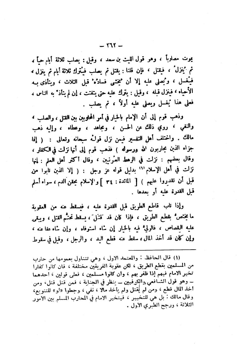 وَاخْتَلَفَ أَهْلُ التَّفْسِيرِ فِيمَنْ نَزَلَ قَوْلُهُ سُبْحَانَهُ وَتَعَالَى: {إِنَّمَا جَزَاءُ الَّذِينَ يُحَارِبُونَ اللَّهَ وَرَسُولَهُ} [الْمَائِدَة: 33]، فَذَهَبَ قَوْمٌ إِلَى أَنَّهَا نَزَلَتْ فِي الْكُفَّارِ، وَقَالَ بَعْضُهُمْ: نَزَلَتْ فِي الرَّهْطِ الْعُرْنِيِّينَ، وَقَالَ أَكْثَرُ أَهْلِ الْعِلْمِ: إِنَّهَا نَزَلَتْ فِي أَهْلِ الإِسْلامِ، بِدَلِيلِ قَوْلِهِ عَزَّ وَجَلَّ: {إِلا الَّذِينَ تَابُوا مِنْ قَبْلِ أَنْ تَقْدِرُوا عَلَيْهِمْ} [الْمَائِدَة: 34] وَالإِسْلامُ يَحْقِنُ الدَّمَ، سَوَاءٌ أَسْلَمَ قَبْلَ الْقُدْرَةِ عَلَيْهِ أَوْ بَعْدَهَا.
