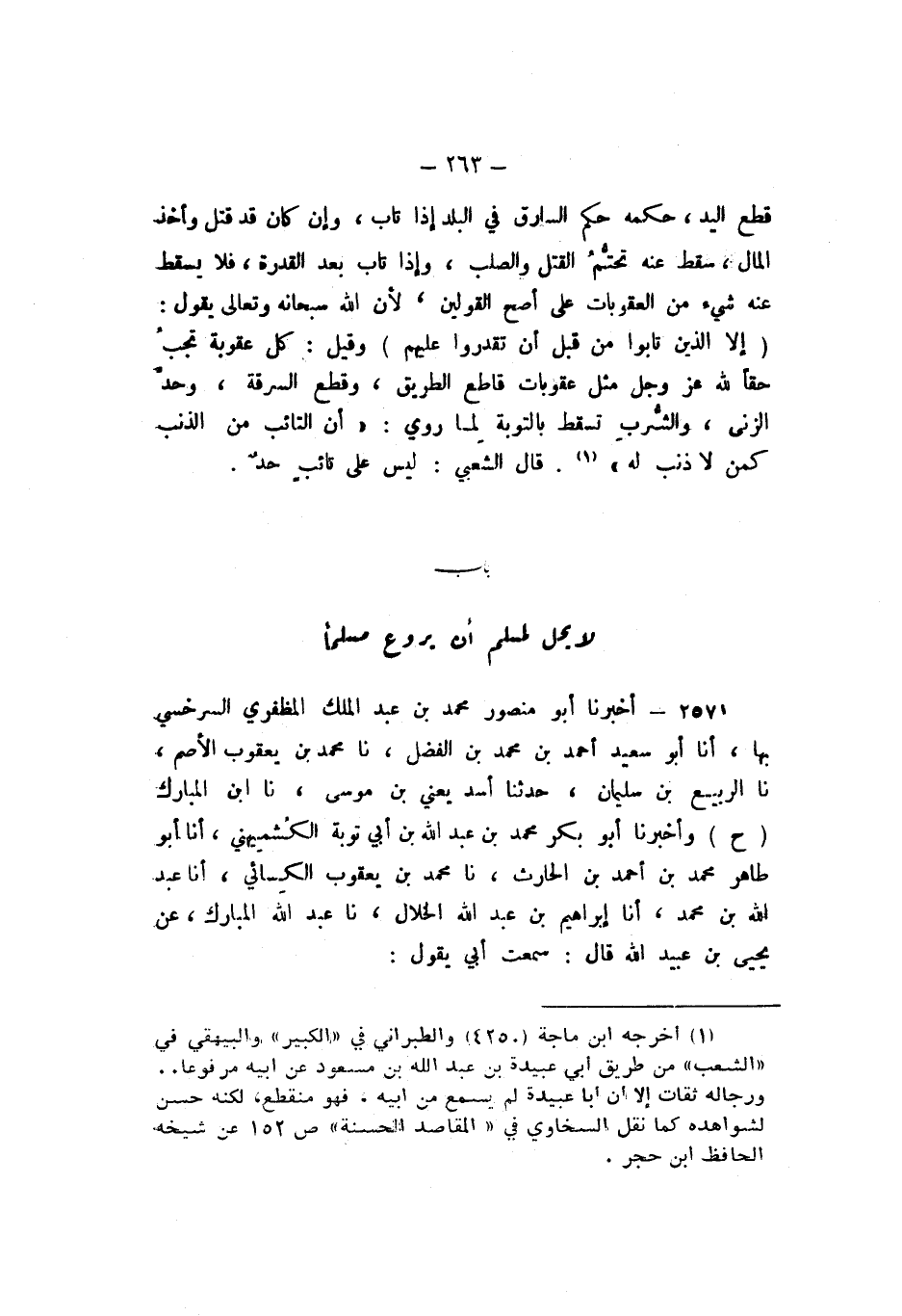 2571 - أَخْبَرَنَا أَبُو مَنْصُورٍ مُحَمَّدُ بْنُ عَبْدِ الْمَلِكِ الْمُظَفَّرِيُّ السَّرَخْسِيُّ، بِهَا، أَنا أَبُو سَعِيدٍ أَحْمَدُ بْنُ مُحَمَّدِ بْنِ الْفَضْلِ، نَا مُحَمَّدُ بْنُ يَعْقُوبَ الأَصَمُّ، نَا الرَّبِيعُ بْنُ سُلَيْمَانَ، حَدَّثَنَا أَسَدٌ يَعْنِي ابْنَ مُوسَى، نَا ابْنُ الْمُبَارَكِ.