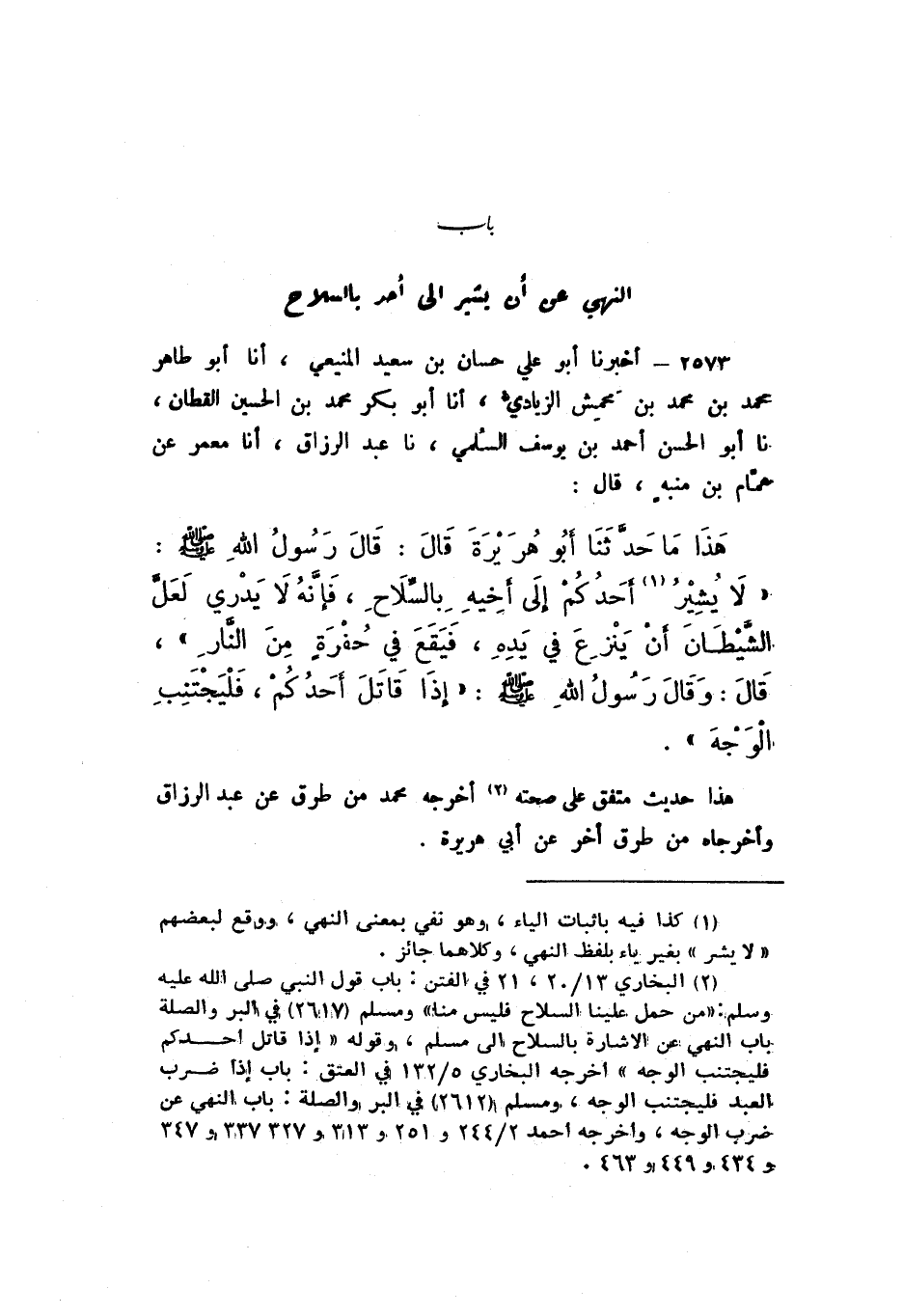 2573 - أَخْبَرَنَا أَبُو عَلِيٍّ حَسَّانُ بْنُ سَعِيدٍ الْمَنِيعِيُّ، أَنا أَبُو طَاهِرٍ مُحَمَّدُ بْنُ مُحَمَّدِ بْنِ مَحْمِشٍ الزِّيَادِيُّ، أَنا أَبُو بَكْرٍ مُحَمَّدُ بْنُ الْحُسَيْنِ الْقَطَّانُ، نَا أَبُو الْحَسَنِ أَحْمَدُ بْنُ يُوسُفَ السُّلَمِيُّ، نَا عَبْدُ الرَّزَّاقِ، أَنا مَعْمَرٌ، عَنْ همَّامِ بْنِ مُنَبِّهٍ، قَالَ: هَذَا مَا حَدَّثَنَا أَبُو هُرَيْرَةَ، قَالَ: قَالَ رَسُولُ اللَّهِ صَلَّى اللهُ عَلَيْهِ وَسَلَّمَ: «لَا يُشِيرُ أَحَدُكُمْ إِلَى أَخِيهِ بالسِّلاحِ، فَإِنَّهُ لَا يَدْرِي لَعَلَّ الشَّيْطَانَ أَنْ يَنْزِعَ فِي يَدِهِ، فَيَقَعَ فِي حُفْرَةٍ مِنَ النَّارِ».