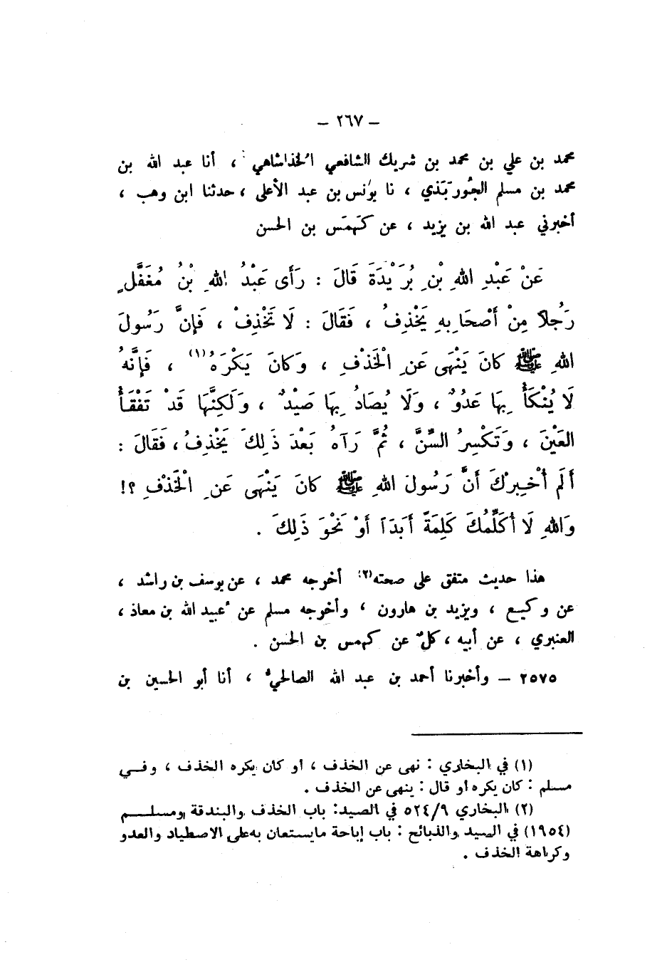 مُحَمَّدُ بْنُ عَلِيِّ بْنِ مُحَمَّدِ بْنِ شَرِيكٍ الشَّافِعِيُّ الْخُذَاشَاهِيُّ، أَنا عَبْدُ اللَّهِ بْنُ مُحَمَّدِ بْنِ مُسْلِمٍ الْجُورَبَذِيُّ، نَا يُونُسُ بْنُ عَبْدِ الأَعْلَى، حَدَّثَنَا ابْنُ وَهْبٍ، أَخْبَرَنِي عَبْدُ اللَّهِ بْنُ يَزِيدَ، عَنْ كَهْمَسِ بْنِ الْحَسَنِ، عَنْ عَبْدِ اللَّهِ بْنِ بُرَيْدَةَ، قَالَ: رَأَى عَبْدُ اللَّهِ بْنُ مُغَفَّلٍ رَجُلا مِنْ أَصْحَابِهِ يَخْذِفُ، فَقَالَ: لَا تَخْذِفْ، فَإِنَّ رَسُولَ اللَّهِ صَلَّى اللهُ عَلَيْهِ وَسَلَّمَ «كَانَ يَنْهَى عَنِ الْخَذْفِ، وَكَانَ يَكْرَهُ، فَإِنَّهُ لَا يُنْكَأْ بِهَا عَدُوٌّ، وَلَا يُصَادُ بِهَا صَيْدٌ، وَلَكِنَّهَا قَدْ تَفْقَأُ الْعَيْنَ، وَتَكْسِرُ السِّنَّ»، ثُمَّ رآهُ بَعْدَ ذَلِكَ يَخْذِفُ، فَقَالَ: أَلَمْ أُخْبِرْكَ أَنَّ رَسُولَ اللَّهِ صَلَّى اللهُ عَلَيْهِ وَسَلَّمَ كَانَ يَنْهَى عَنِ الْخَذْفِ؟! وَاللَّهِ لَا أُكَلِّمُكَ كَلِمَةً أَبَدًا، أَوْ نَحْوَ ذَلِكَ.
