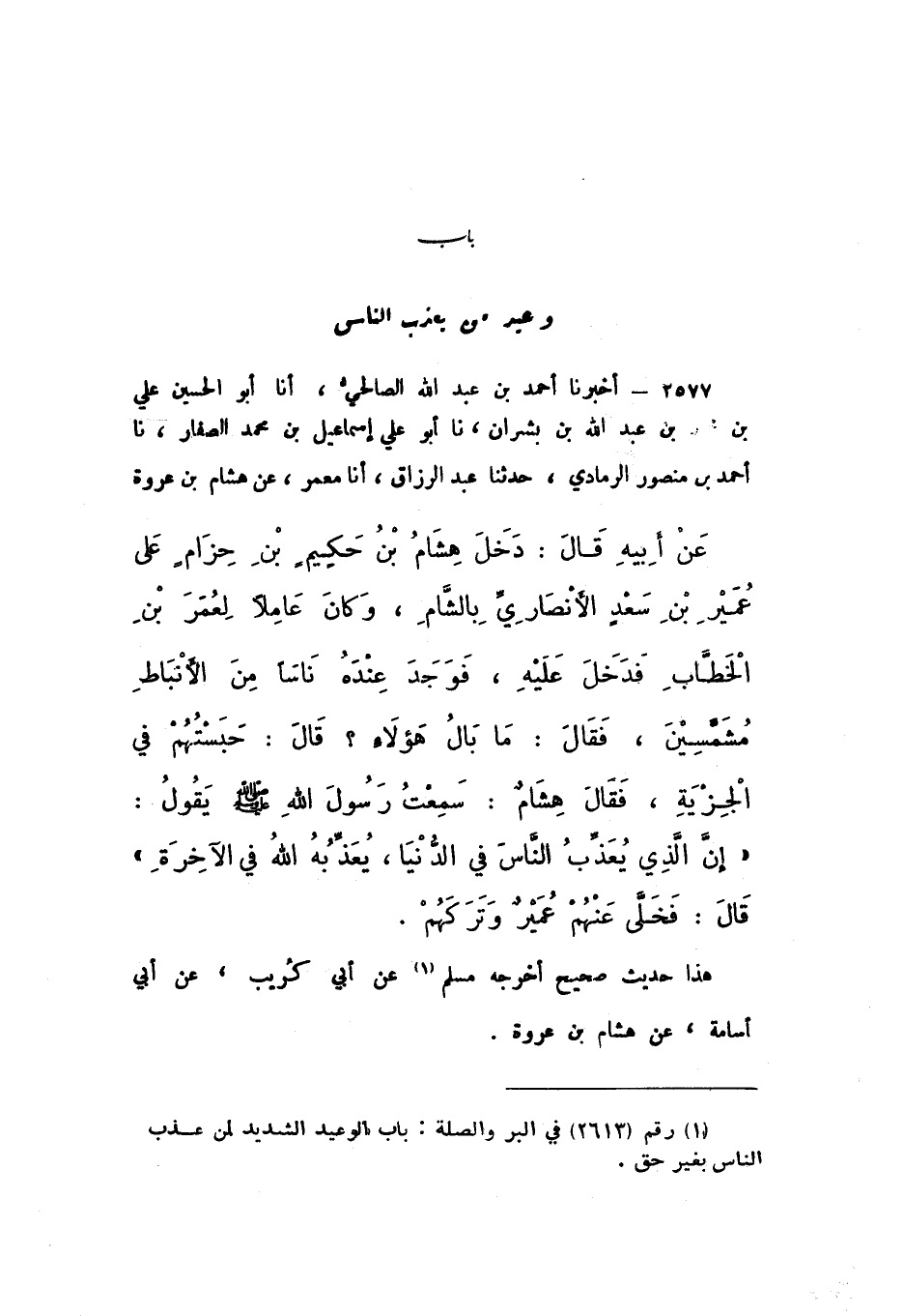 2577 - أَخْبَرَنَا أَحْمَدُ بْنُ عَبْدِ اللَّهِ الصَّالِحِيُّ، أَنا أَبُو الْحُسَيْنِ عَلِيُّ بْنُ مُحَمَّدِ بْنِ عَبْدِ اللَّهِ بْنِ بِشْرَانَ، نَا أَبُو عَلِيٍّ إِسْمَاعِيلُ بْنُ مُحَمَّدٍ الصَّفَّارُ، نَا أَحْمَدُ بْنُ مَنْصُورٍ الرَّمَادِيُّ، حَدَّثَنَا عَبْدُ الرَّزَّاقِ، أَنا مَعْمَرٌ، عَنْ هِشَامِ بْنِ عُرْوَةَ، عَنْ أَبِيهِ، قَالَ: دَخَلَ هِشَامُ بْنُ حَكِيمِ بْنِ حِزَامٍ عَلَى عُمَيْرِ بْنِ سَعْدٍ الأَنْصَارِيِّ بِالشَّامِ، وَكَانَ عَامِلا لِعُمَرَ بْنِ الْخَطَّابِ فَدَخَلَ عَلَيْهِ، فَوَجَدَ عِنْدَهُ نَاسًا مِنَ الأَنْبَاطِ مُشَمَّسِينَ، فَقَالَ: مَا بَالُ هَؤُلاءِ؟ قَالَ: حَبَسْتُهُمْ فِي الْجِزْيَةِ، فَقَالَ هِشَامٌ: سَمِعْتُ رَسُولَ اللَّهِ صَلَّى اللهُ عَلَيْهِ وَسَلَّمَ، يَقُولُ: «إِنَّ الَّذي يُعَذِّبُ النَّاسَ فِي الدُّنْيَا، يُعَذِّبُهُ اللَّهُ فِي الآخِرَةِ»، قَالَ: فَخَلَّى عَنْهُمْ عُمَيْرٌ وَتَرَكَهُمْ.