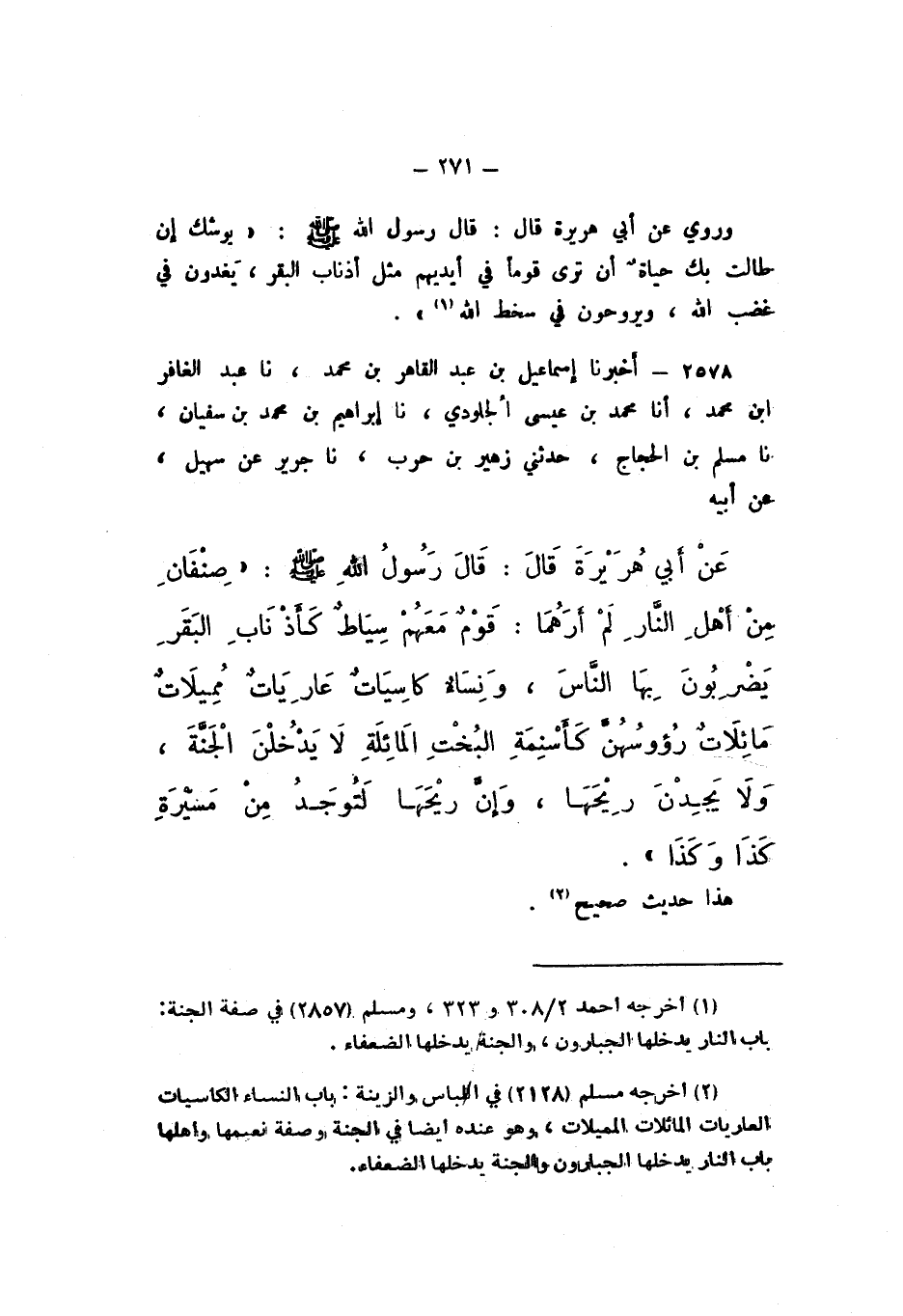 2578 - أَخْبَرَنَا إِسْمَاعِيلُ بْنُ عَبْدِ الْقَاهِرِ بْنِ مُحَمَّدٍ، نَا عَبْدُ الْغَافِرِ بْنُ مُحَمَّدٍ، أَنا مُحَمَّدُ بْنُ عِيسَى الْجُلُودِيُّ، نَا إِبْرَاهِيمُ بْنُ مُحَمَّدِ بْنِ سُفْيَانَ، نَا مُسْلِمُ بْنُ الْحَجَّاجِ، حَدَّثَنِي زُهَيْرُ بْنُ حَرْبٍ، نَا جَرِيرٌ، عَنْ سُهَيْلٍ، عَنْ أَبِيهِ، عَنْ أَبِي هُرَيْرَةَ، قَالَ: قَالَ رَسُولُ اللَّهِ صَلَّى اللهُ عَلَيْهِ وَسَلَّمَ: " صِنْفَانِ مِنْ أَهْلِ النَّارِ لَمْ أَرَهُمَا: قَوْمٌ مَعَهُمْ سِيَاطٌ كَأَذْنَابِ الْبَقَرِ يَضْرِبُونَ بِهَا النَّاسَ، وَنِسَاءٌ كَاسِيَاتٌ عَارِيَاتٌ مُمِيلَاتٌ مَائِلاتٌ رُءُوسُهُنَّ كَأَسْنِمَةِ الْبُخْتِ الْمَائِلَةِ لَا يَدْخُلْنَ الجَنَّةَ، وَلا يَجِدْنَ رِيحَهَا، وَإِنَّ رِيحَهَا لَتُوجَدُ مِنْ مَسِيرَةِ كَذَا وَكَذَا ".