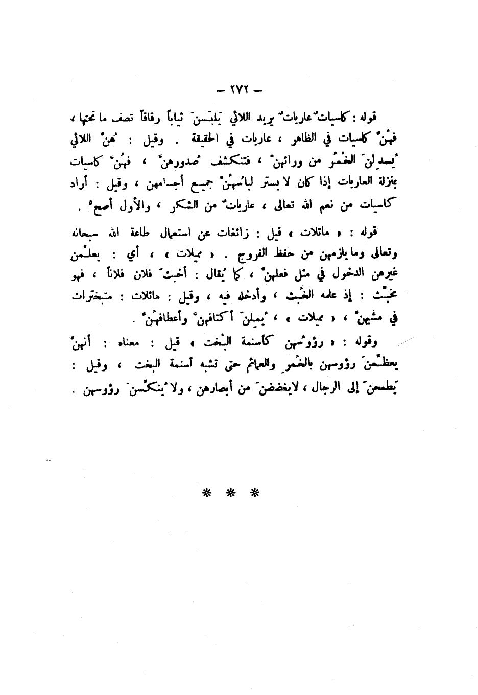 وَقِيلَ: هُنَّ اللائي يُسْدِلْنَ الْخُمُرَ مِنْ وَرَائِهِنَّ، فَتَنْكَشِفُ صُدُورُهُنَّ، فَهُنَّ كَاسِيَاتٌ بِمَنْزِلَةِ الْعَارِيَاتِ إِذَا كَانَ لَا يَسْتُرُ لِبَاسُهُنَّ جَمِيعَ أَجْسَامِهِنَّ، وَقِيلَ: أَرَادَ كَاسِيَاتٌ مِنْ نِعَمِ اللَّهِ تَعَالَى، عَارِيَاتٌ مِنَ الشُّكْرِ، وَالأَوَّلُ أَصَحُّ.