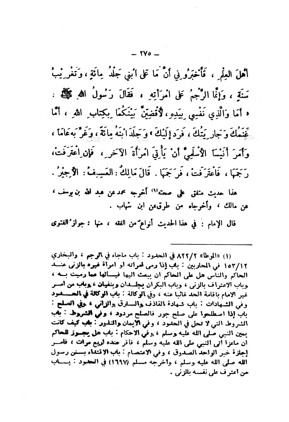 أَهْلَ الْعِلْمِ، فَأَخْبَرُونِي أَنَّ مَا عَلَى ابْنِي جَلْدُ مِائَةٍ، وَتَغْرِيبُ سَنَةٍ، وَإِنَّمَا الرَّجْمُ عَلَى امْرَأَتِهِ، فَقَالَ رَسُولُ اللَّهِ صَلَّى اللهُ عَلَيْهِ وَسَلَّمَ: «أَمَا والَّذي نَفْسِي بِيَدِهِ، لأَقْضِيَنَّ بَيْنَكُمَا بِكِتَابِ اللَّهِ، أَمَّا غَنَمُكَ وَجَارِيَتُكَ، فَرَدٌّ إِلَيْكَ»، وَجَلَدَ ابْنَهُ مِائَةً، وَغَرَّبَهُ عَامًا، وَأَمَرَ أُنَيْسًا الأَسْلَمِيَّ أَنْ يَأْتِيَ امْرَأَةَ الآخَرِ، فَإِنِ اعْتَرَفَتْ رَجَمَهَا، فَاعْتَرَفَتْ، فَرَجَمَهَا.