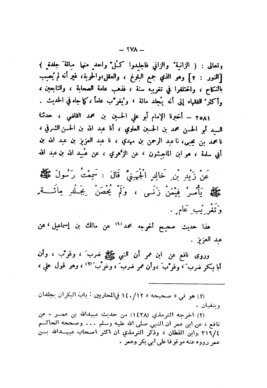 2581 - أَخْبَرَنَا الإِمَامُ أَبُو عَلِيٍّ الْحُسَيْنُ بْنُ مُحَمَّدٍ الْقَاضِي، حَدَّثَنَا السَّيِّدُ أَبُو الْحَسَنِ مُحَمَّدُ بْنُ الْحُسَيْنِ الْعَلَوِيُّ، أَنا عَبْدُ اللَّهِ بْنُ الْحَسَنِ الشَّرْقِيُّ، نَا مُحَمَّدُ بْنُ يَحْيَى، نَا عَبْدُ الرَّحْمَنِ بْنُ مَهْدِيٍّ، نَا عَبْدُ الْعَزِيزِ بْنُ عَبْدِ اللَّهِ بْنِ أَبِي سَلَمَةَ هُوَ ابْنُ الْمَاجِشُونِ، عَنِ الزُّهرِيِّ، عَنْ عُبَيْدِ اللَّهِ بْنِ عَبْدِ اللَّهِ، عَنْ زَيْدِ بْنِ خَالِدٍ الْجُهَنِيِّ، قَالَ: سَمِعْتُ رَسُولَ اللَّهِ صَلَّى اللهُ عَلَيْهِ وَسَلَّمَ «يَأْمُرُ فِيمَنْ زَنَى وَلَمْ يُحْصَنْ بِجَلْدِ مِائَةٍ، وتَغْرِيبِ عَامٍ».