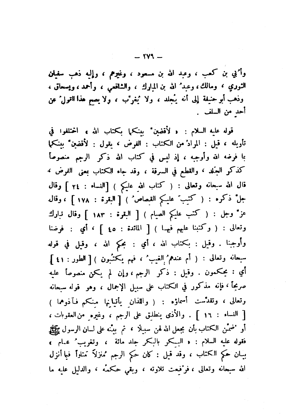 قَوْلُهُ عَلَيْهِ السَّلامُ: «لأَقْضِيَنَّ بَيْنَكُمَا بِكِتَابِ اللَّهِ» اخْتَلَفُوا فِي تَأْوِيلِهِ، قِيلَ: الْمُرَادُ مِنَ الْكِتَابِ: الْفَرْضُ، يَقُولُ: لأَقْضِيَنَّ بَيْنَكُمَا بِمَا فَرَضَهُ اللَّهُ وَأَوْجَبَهُ، إِذْ لَيْسَ فِي كِتَابِ اللَّهِ ذِكْرُ الرَّجْمِ مَنْصُوصًا كَذِكْرِ الْجَلْدِ، وَالْقَطْعِ فِي السَّرِقَةِ، وَقَدْ جَاءَ الْكِتَابُ بِمَعْنَى الْفَرْضِ، قَالَ اللَّهُ سُبْحَانَهُ وَتَعَالَى: {كِتَابَ اللَّهِ عَلَيْكُمْ} [النِّسَاء: 24]، وَقَالَ جَلَّ ذِكْرُهُ: {كُتِبَ عَلَيْكُمُ الْقِصَاصُ} [الْبَقَرَة: 178]، وَقَالَ عَزَّ وَجَلَّ: {كُتِبَ عَلَيْكُمُ الصِّيَامُ} [الْبَقَرَة: 183]، وَقَالَ تَبَارَكَ وَتَعَالَى: {وَكَتَبْنَا عَلَيْهِمْ فِيهَا} [الْمَائِدَة: 45]، أَيْ: فَرَضْنَا وَأَوْجَبْنَا.