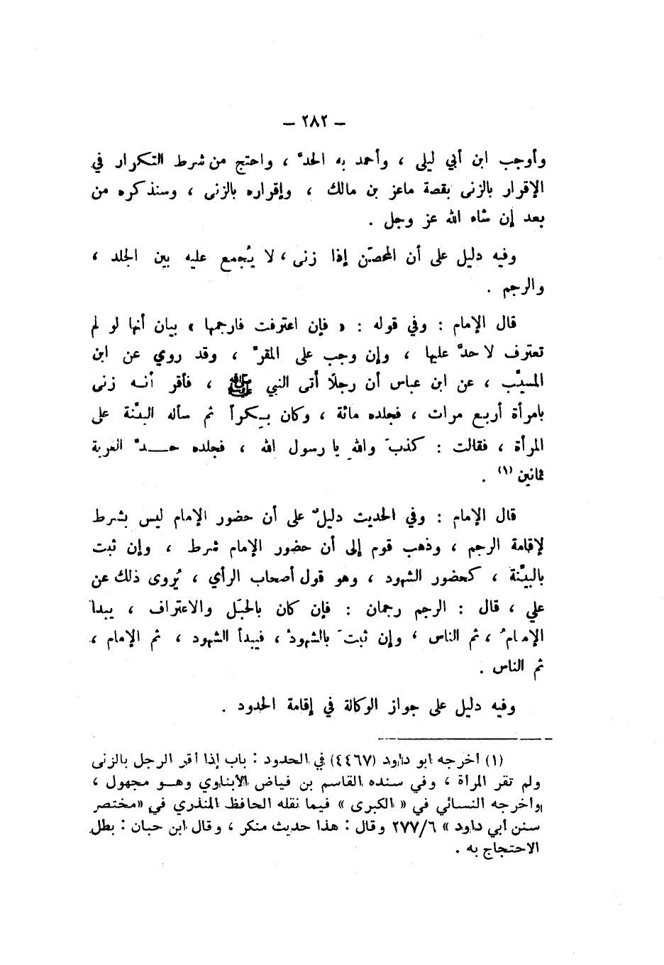 قَالَ الإِمَامُ: وَفِي الْحَدِيثِ دَلِيلٌ عَلَى أَنَّ حُضُورَ الإِمَامِ لَيْسَ بِشَرْطٍ لإِقَامَةِ الرَّجْمِ، وَذَهَبَ قَوْمٌ إِلَى أَنَّ حُضُورَ الإِمَامِ شَرْطٌ، وَإِنْ ثَبَتَ بِالْبَيِّنَةِ، كَحُضُورِ الشُّهُودِ، وَهُوَ قَوْلُ أَصْحَابِ الرَّأْيِ، يُرْوَى ذَلِكَ عَنْ عَلِيٍّ، قَالَ: الرَّجْمُ رَجْمَانِ: فَإِنْ كَانَ بِالْحَبَلِ وَالاعْتِرَافِ، يَبْدَأُ الإِمَامُ ثُمَّ النَّاسُ، وَإِنْ ثَبَتَ بِالشُّهُودِ، فَيُبْدَأُ بِالشُّهُودِ، فَيُبْدَأُ بِالشُّهُودِ ثُمَّ الإِمَامِ ثُمَّ النَّاسِ.