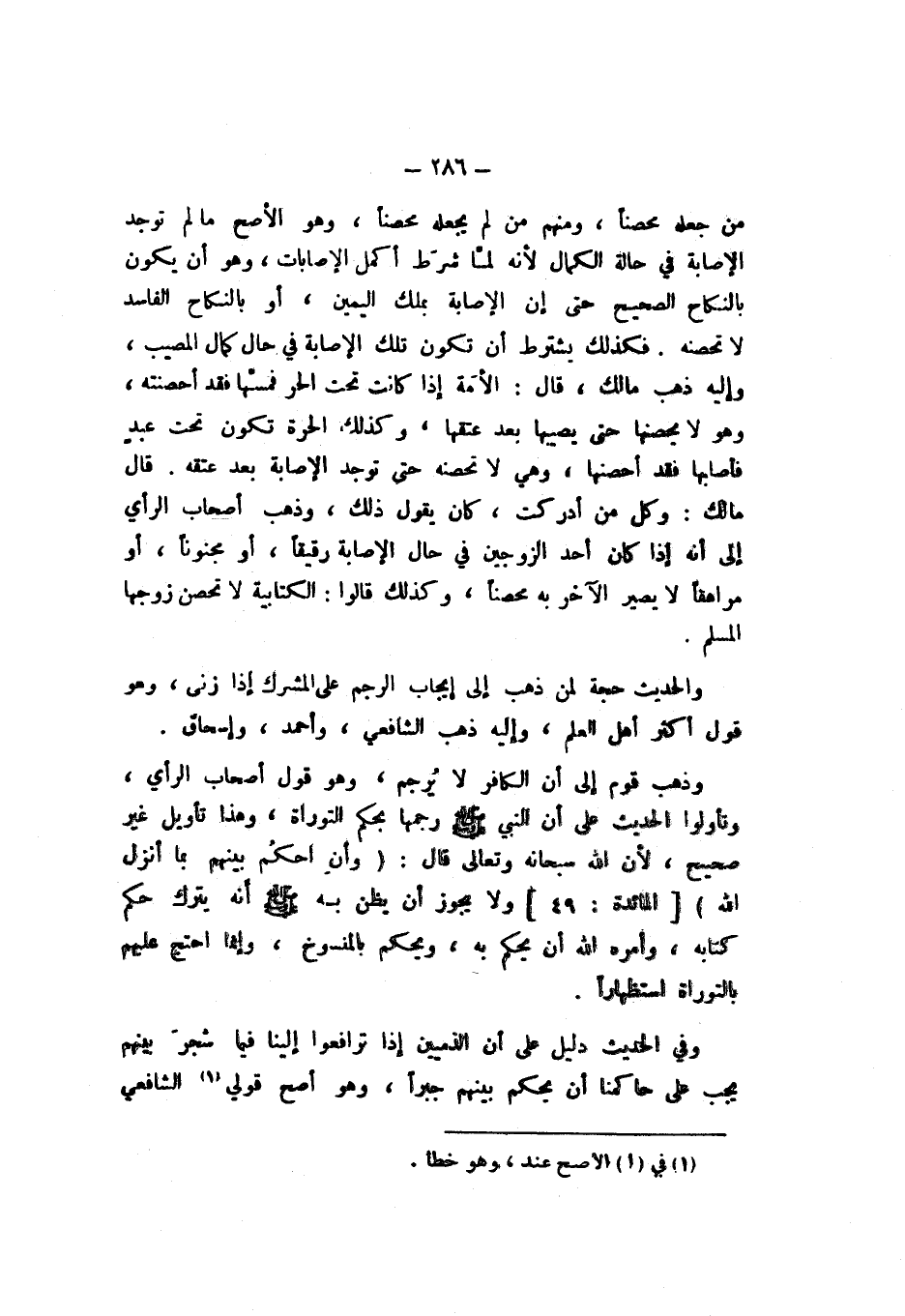 وَذَهَبَ قَوْمٌ إِلَى أَنَّ الْكَافِرَ لَا يُرْجَمُ، وَهُوَ قَوْلُ أَصْحَابِ الرَّأْيِ، وَتَأَوَّلُوا الْحَدِيثَ عَلَى أَنَّ النَّبِيَّ صَلَّى اللهُ عَلَيْهِ وَسَلَّمَ رَجَمَهَا بِحُكْمِ التَّوْرَاةِ، وَهَذَا تَأْوِيلٌ غَيْرُ صَحِيحٍ، لأَنَّ اللَّهَ سُبْحَانَهُ وَتَعَالَى قَالَ: {وَأَنِ احْكُمْ بَيْنَهُمْ بِمَا أَنْزَلَ اللَّهُ} [الْمَائِدَة: 49]، وَلا يَجُوزُ أَنْ يُظَنَّ بِهِ صَلَّى اللهُ عَلَيْهِ وَسَلَّمَ أَنَّهُ يَتْرُكُ حُكْمَ كِتَابِهِ، وَأَمَرَهُ اللَّهُ أَنْ يَحْكُمَ بِهِ، وَيَحْكُمُ بِالْمَنْسُوخِ، وَإِنَّمَا احْتَجَّ عَلَيْهِمْ بِالتَّوْرَاةِ اسْتِظْهَارًا.