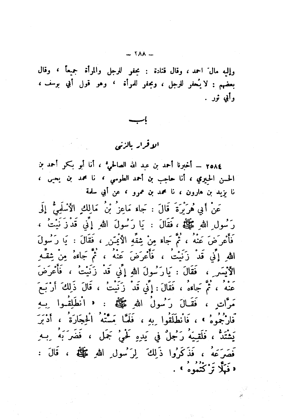 2584 - أَخْبَرَنَا أَحْمَدُ بْنُ عَبْدِ اللَّهِ الصَّالِحِيُّ، أَنا أَبُو بَكْرٍ أَحْمَدُ بْنُ الْحَسَنِ الْحِيرِيُّ، أَنا حَاجِبُ بْنُ أَحْمَدَ الطُّوسِيُّ، نَا مُحَمَّدُ بْنُ يَحْيَى، نَا يَزِيدُ بْنُ هَارُونَ، نَا مُحَمَّدُ بْنُ عَمْرٍو، عَنْ أَبِي سَلَمَةَ، عَنْ أَبِي هُرَيْرَةَ، قَالَ: جَاءَ مَاعِزُ بْنُ مَالِكٍ الأَسْلَمِيُّ إِلَى رَسُولِ اللَّهِ صَلَّى اللهُ عَلَيْهِ وَسَلَّمَ، فَقَالَ: يَا رَسُولَ اللَّهِ، إِنِّي قَدْ زَنَيْتُ.