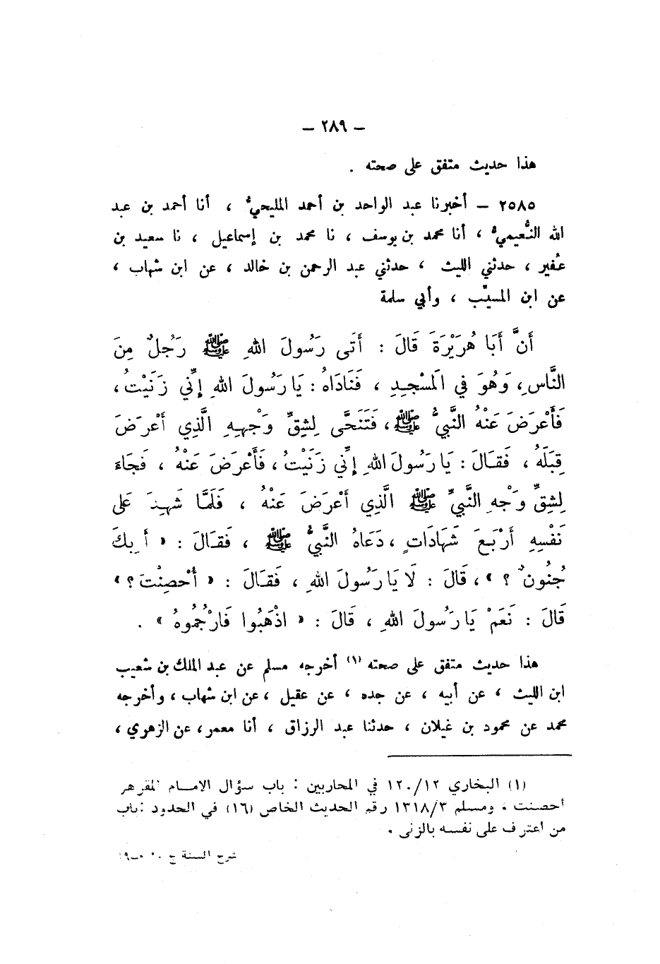 2585 - أَخْبَرَنَا عَبْدُ الْوَاحِدِ بْنُ أَحْمَدَ الْمَلِيحِيُّ، أَنا أَحْمَد بْن عَبْدِ اللَّهِ النُّعَيْمِيُّ، أَنا مُحَمَّدُ بْنُ يُوسُفَ، نَا مُحَمَّدُ بْنُ إِسْمَاعِيلَ، نَا سَعِيدُ بْنُ عُفَيْرٍ، حَدَّثَنِي اللَّيْثُ، حَدَّثَنِي عَبْدُ الرَّحْمَنِ بْنُ خَالِدٍ، عَنِ ابْنِ شِهَابٍ، عَنِ ابْنِ الْمُسَيِّبِ، وَأَبِي سَلَمَةَ، أَنَّ أَبَا هُرَيْرَةَ، قَالَ: أَتَى رَسُولَ اللَّهِ صَلَّى اللهُ عَلَيْهِ وَسَلَّمَ رَجُلٌ مِنَ النَّاسِ، وهوَ فِي الْمَسْجِدِ، فَنَادَاهُ: يَا رَسُولَ اللَّهِ، إِنِّي زَنَيْتُ.