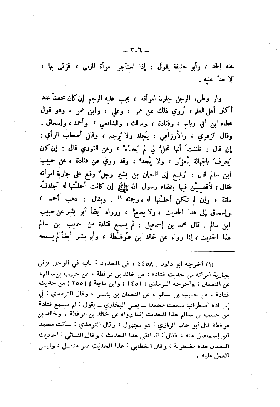 وَقَدْ رُوِيَ عَنْ قَتَادَةَ، عَنْ حَبِيبِ بْنِ سَالِمٍ، قَالَ: رُفِعَ إِلَى النُّعْمَانِ بْنِ بَشِيرٍ رَجُلٌ وَقَعَ عَلَى جَارِيَةِ امْرَأَتِهِ، فَقَالَ: لأَقْضِيَنَّ فِيهَا بِقَضَاءِ رَسُولِ اللَّهِ صَلَّى اللهُ عَلَيْهِ وَسَلَّمَ إِنْ كَانَتْ أَحَلَّتْهَا لَهُ جَلَدْتُهُ مِائَةً، وَإِنْ لَمْ تَكُنْ أَحَلَّتْهَا لَهُ، رَجَمْتُهُ ".