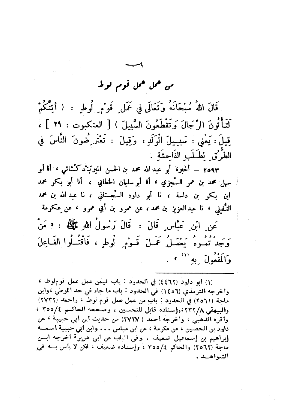 2593 - أَخْبَرَنَا أَبُو عَبْدِ اللَّهِ مُحَمَّدُ بْنُ الْحَسَنِ الْمِيرْبَنْدُ كُشَائِيُّ، أَنا أَبُو سَهْلٍ مُحَمَّدُ بْنُ عُمَرَ السِّجْزِيُّ، أَنا أَبُو سُلَيْمَانَ الْخَطَّابِيُّ، أَنا أَبُو بَكْرٍ مُحَمَّدُ بْنُ بَكْرِ بْنِ دَاسَةَ، نَا أَبُو دَاوُدَ السِّجِسْتَانِيُّ، نَا عَبْدُ اللَّهِ بْنُ مُحَمَّدٍ النُّفَيْلِيُّ، نَا عَبْدُ الْعَزِيزِ بْنُ مُحَمَّدٍ، عَنْ عَمْرِو بْنِ أَبِي عَمْرٍو، عَنْ عِكْرِمَةَ، عَنِ ابْنِ عَبَّاسٍ، قَالَ: قَالَ رَسُولُ اللَّهِ صَلَّى اللهُ عَلَيْهِ وَسَلَّمَ: «مَنْ وَجَدْتُمُوهُ يَعْمَلُ عَمَلَ قَوْمِ لُوطٍ، فَاقْتُلُوا الْفَاعِلَ، وَالْمَفْعُولَ بِهِ»