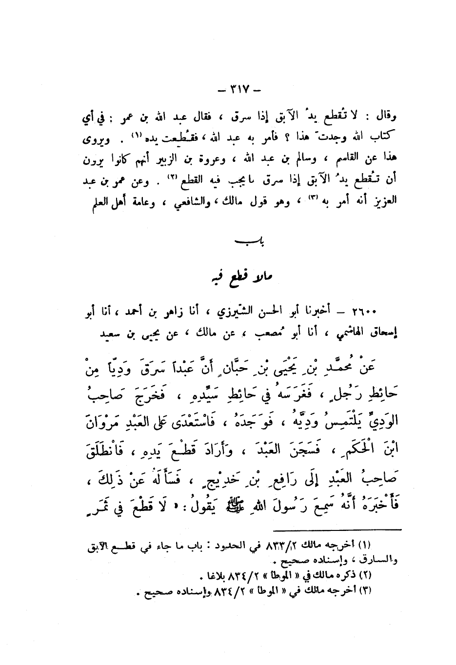 2600 - أَخْبَرَنَا أَبُو الْحَسَنِ الشِّيرَزِيُّ، أَنا زَاهِرُ بْنُ أَحْمَدَ، أَنا أَبُو إِسْحَاقَ الْهَاشِمِيُّ، أَنا أَبُو مُصْعَبٍ، عَنْ مَالِكٍ، عَنْ يَحْيَى بْنِ سَعِيدٍ، عَنْ مُحَمَّدِ بْنِ يَحْيَى بْنِ حِبَّانَ، أَنَّ عَبْدًا سَرَقَ وَدِيًّا مِنْ حَائِطِ رَجُلٍ، فَغَرَسَهُ فِي حَائِطِ سَيِّدِهِ، فَخَرَجَ صَاحِبُ الْوَدِيِّ يَلْتَمِسُ وديه، فَوَجَدَهُ، فَاسْتَعْدَى عَلَى الْعَبْدِ مَرْوَانَ بْنُ الْحَكَمِ، فَسَجَنَ الْعَبْدَ، وَأَرَادَ قَطْعَ يَدِهِ، فَانْطَلَقَ صَاحِبُ الْعَبْدِ إِلَى رَافِعِ بْنِ خَدِيجٍ، فَسَأَلَهُ عَنْ ذَلِكَ، فَأَخْبَرَهُ أَنَّهُ سَمِعَ رَسُولَ اللَّهِ صَلَّى اللهُ عَلَيْهِ وَسَلَّمَ، يَقُولُ: لَا قَطْعَ فِي ثَمَرٍ،
